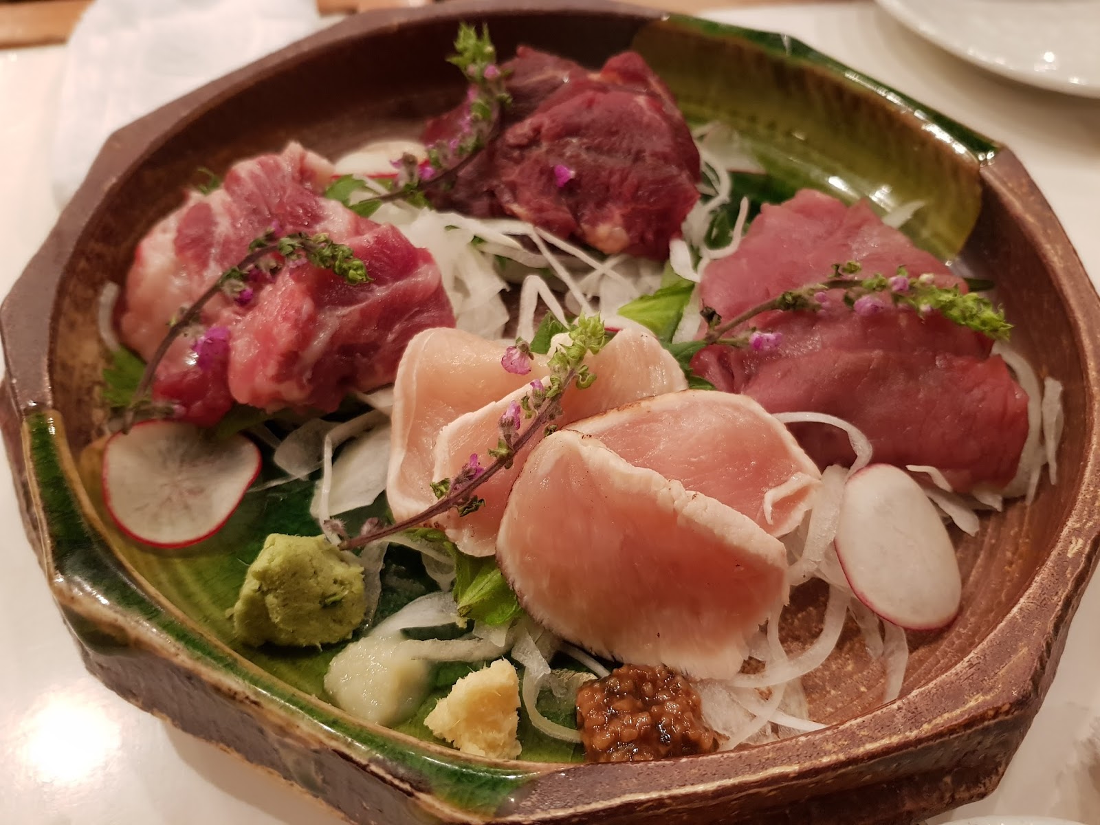 Slices of meat sashimi of duck, pork, beef, and horse.