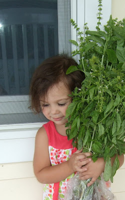 We scored some basil at the farmer’s market the other day, so we made some pesto. I love me some pesto pasta. I was able to freeze some, but boy, it takes a lot of basil to make pesto in large quantities. Ah well.