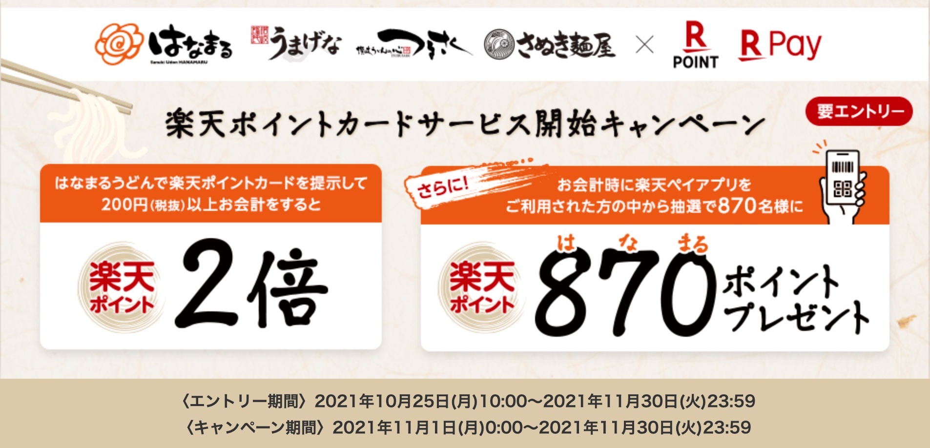 また楽天ポイントカードの導入を記念して2021年11月1日(月)から11月30日(火)まで、「はなまるうどん楽天ポイントカードサービス開始キャンペーン」( https://pointcard.rakuten.co.jp/campaign/hanamaruudon/20211101/ )を実施し、エントリーの上で期間中に対象店舗にて200円(税抜)以上を購入して会計時に楽天ポイントカードを提示すると通常の2倍の楽天ポイントをプレゼントします。