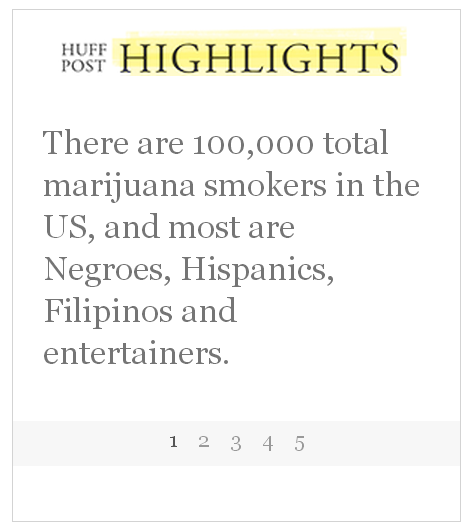 The HuffPost Highlights above are real, not satire, and can be viewed here, on the right side of the page (no pun). After much effort I traced #1 racist dribble to a quote by Harry J. Anslinger, who was the first Commissioner of the U.S. Treasury Department’s Federal Bureau of Narcotics, in 1930.
