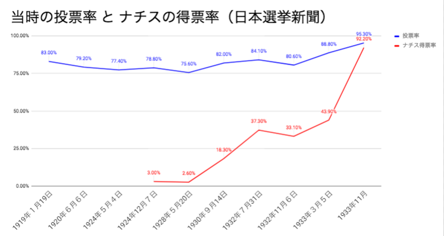 これは、ナチ党が登場してからのドイツワイマール憲法化での選挙の投票率の推移です。ナチ党が台頭していく過程で、投票率があがっていることがわかります。よく、ナチスは人々の無関心が作り上げたと言われますが、少なくとも選挙の投票率はあがっており、表現だけでは正確にナチスを理解することができないのではないかと思います。