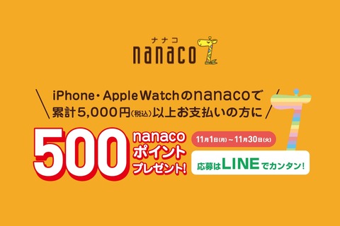 セブン&アイ・ホールディングスがグループ傘下のセブン・カードサービスは1日、同社が展開するグループ独自の非接触IC機能「FeliCa」を用いたかざす決済&電子マネー「nanaco」をiPhoneやApple Watchで利用できる決済サービス「Apple Pay」にて利用して累計5,000円(税込)以上支払うとnanacoポイントを500ポイントプレゼントするキャンペーンを実施するとお知らせしています。