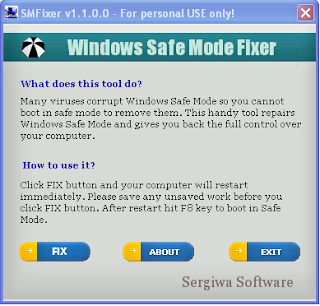 Ok shobat langsung aza,, mungkin shobat pernah mengalami safe mode pc shobat bermasalah dan tidak bisa di access karna mungkin corrupt atau serangan virus yang usil dan menjengkelkan, nah gampang shob kali ini saya akan sedikit berbagi aplikasi untuk perbaiki masalah seperti safe mode ini ,, namanya safe mode fixer, safe mode fixer ini portable dan ukurannya pun kecil , bisa langsung dijalankan berikut penampakannya