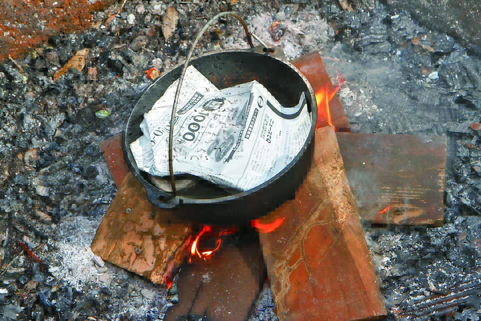 七輪、餅網、鍋(ここではダッチオーブン)、一斗缶を浅くカットして底を抜いたもの、ドライヤー、ガスバーナー、火バサミ、釉薬を入れる容器、へら、刷毛etc.