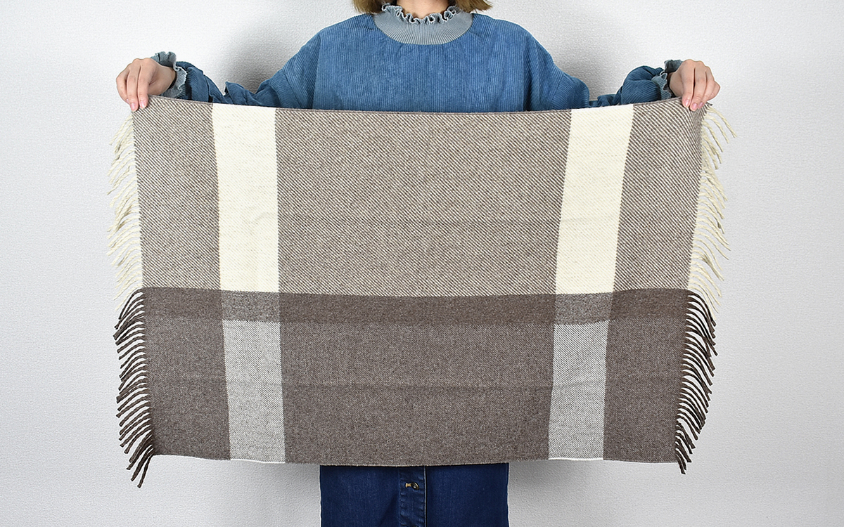 両端にフリンジのついたシンプルなデザインは、落ち着いたブラウンが印象的。商品名の通り無染色で仕上げてあり、自然そのままの色をまとえるのもポイントです。自宅はもちろん職場でも使いやすい柄がうれしいですよね。