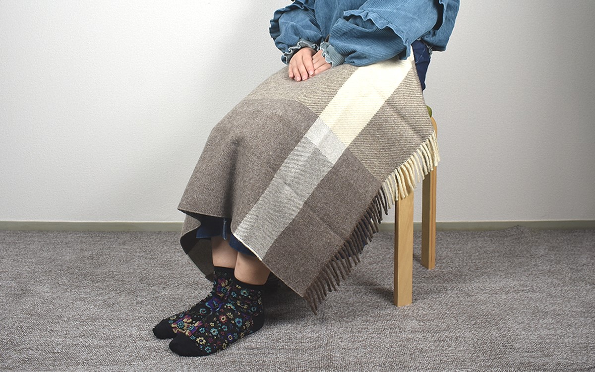 それでは実際に、椅子に座った状態でひざの上に広げてみましょう。足全体をふわっと覆うと、次第にポカポカと暖かくなってきました。ウール100%でできているため、保温性の高さはバツグンです。全体を広げるとお腹から膝下までしっかりカバーし、半分に畳んで掛ければ膝と腿を重点的に寒さから守ってくれますよ。