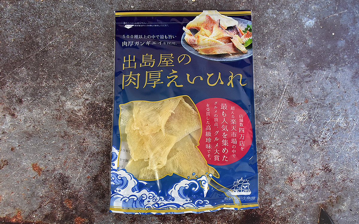 居酒屋でよく見かける定番のおつまみ“えいひれ”。歯ごたえと塩気が絶妙でお酒によく合うため、必ず頼むという人も多いのではないでしょうか。家でも食べたいと思う半面、市販のえいひれは薄くて物足りないこともしばしば…。そこで今回お取り寄せしたのが双葉水産の「出島屋の肉厚えいひれ」(1280円/税込)です。過去には楽天グルメ甲子園シーフード部門で第2位に輝いたこともある同商品の、人気の秘密にさっそく迫っていきましょう。