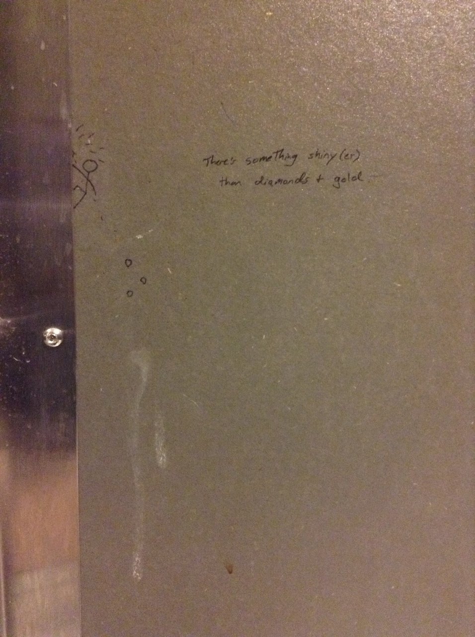 新しい図書館のトイレの個室の壁に書いてあった落書き。 「 There’s something shiny than diamonds and gold. 」 自分にとってダイヤモンドやゴールドより光り輝くものは何だろうか。