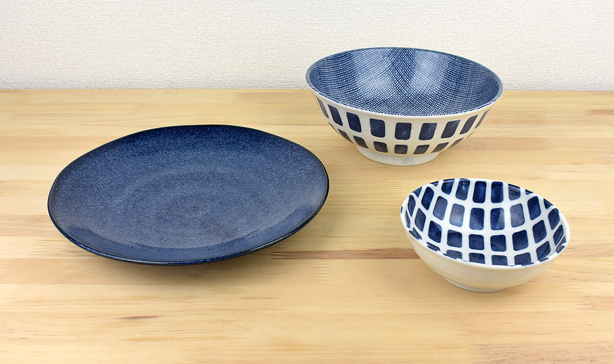 ●落ち着いた風合いを放つ「超軽量磁器 カル:エクレ3点セット 窯変紺・青格子」(ニトリ)