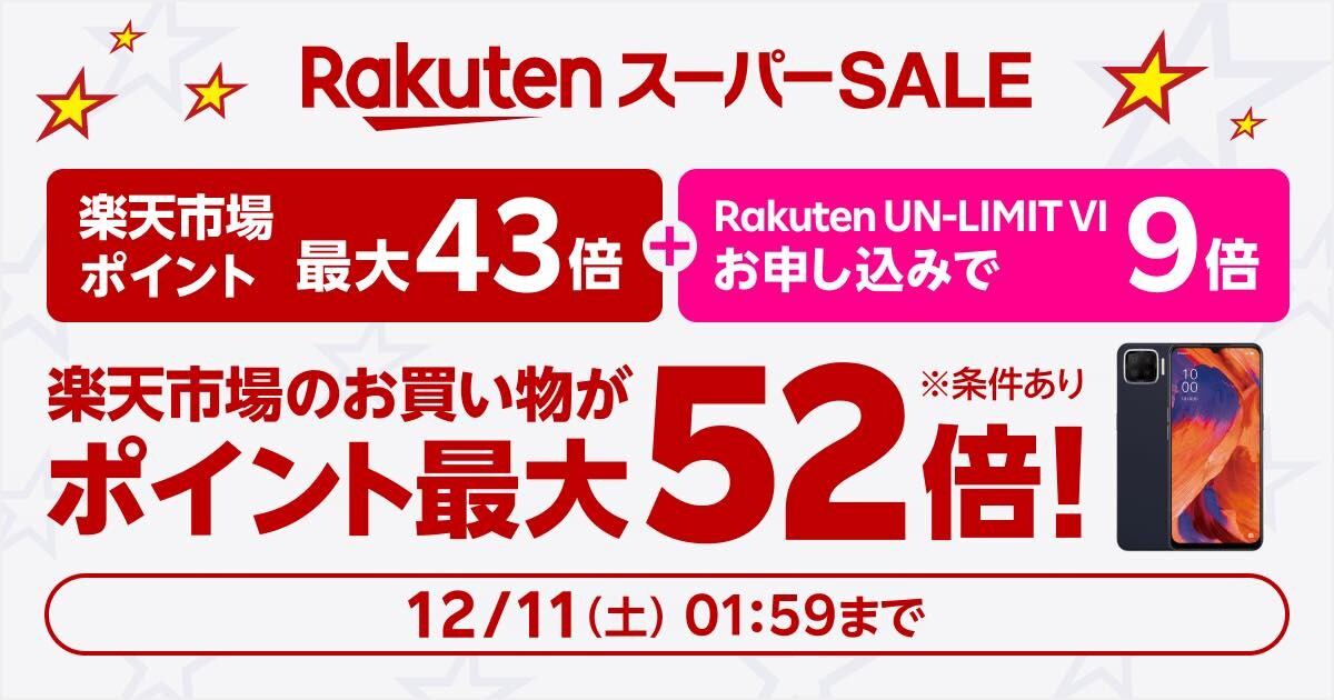 また同期間においてRakuten UN-LIMIT VIを新規で申し込んだ場合を対象に「楽天スーパーSALE連動企画 Rakuten UN-LIMIT VIのお申し込みで楽天市場でのお買い物ポイント+9倍キャンペーン」を実施し、楽天スーパーSALEの最大43倍の特典と合わせると、楽天市場での買い物に応じて付与される楽天ポイントの付与率が通常の最大52倍になるということです。