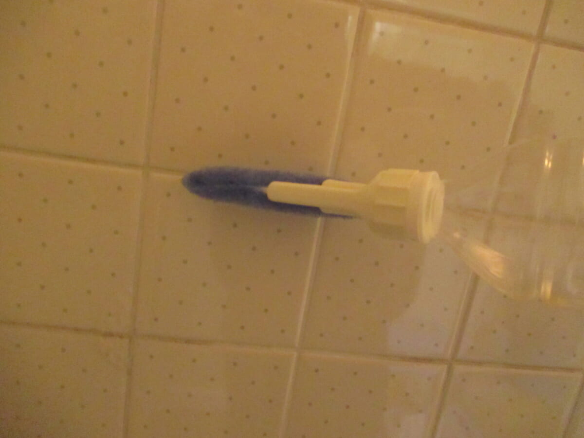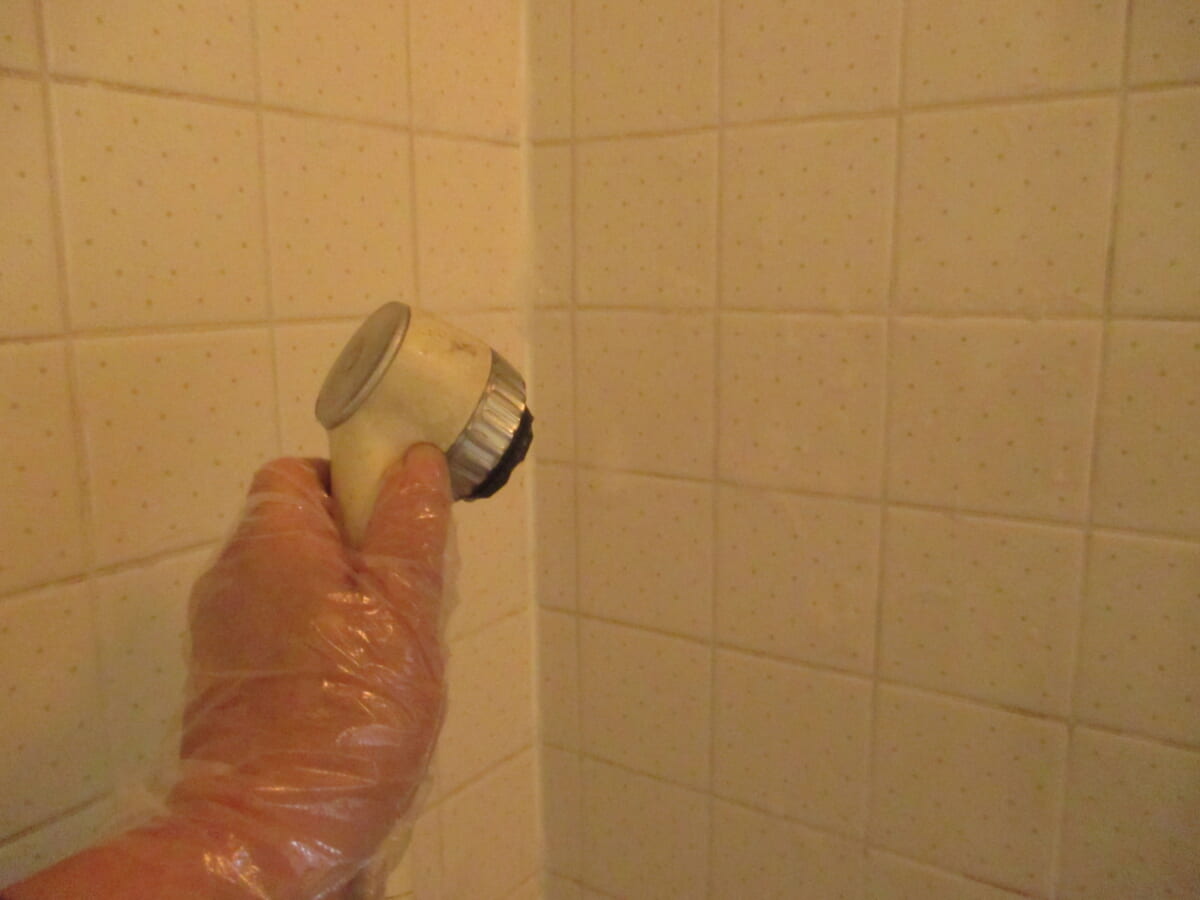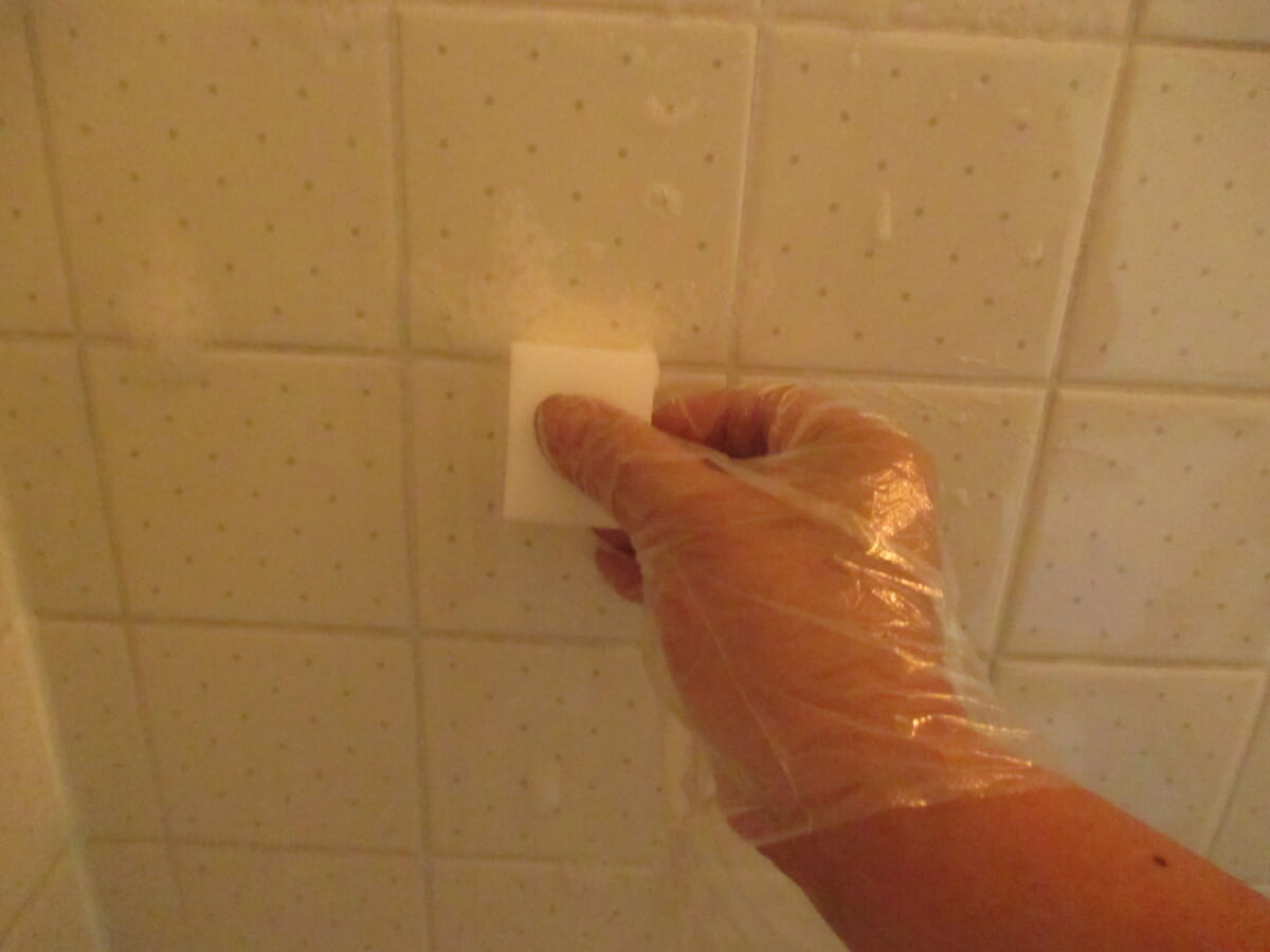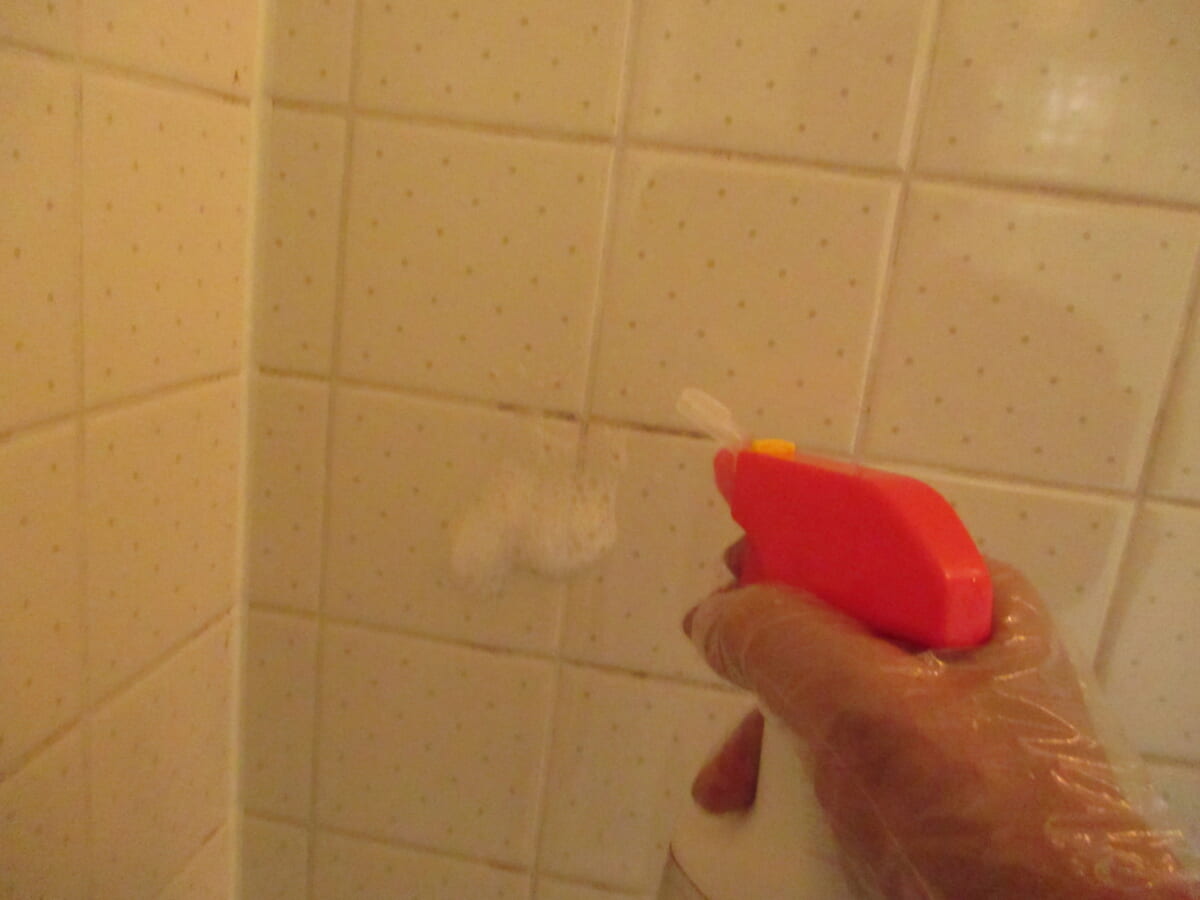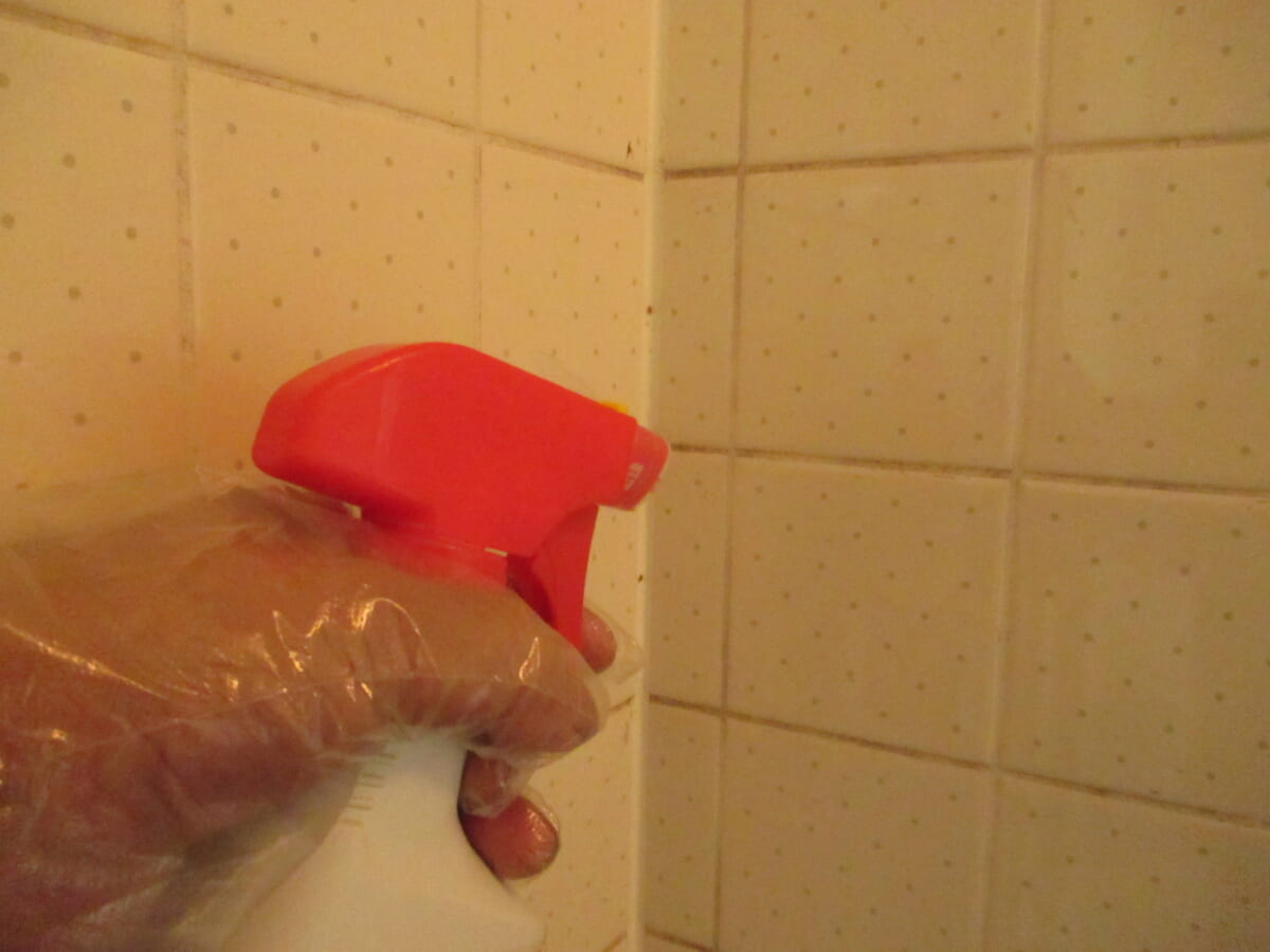 タイル面に洗剤を吹きつけてウエスで拭き洗いしたら、すかさずシャワーなどで洗剤分をよく洗い流す。次に目地部分を狙って洗剤を吹きつける。吹きつけ部分が目線より上になる場合は、洗剤をスポンジなどに取って塗りつけ、洗剤が目に入らないように作業する。洗剤の説明にオープンタイムを置くように指示があればそれに従い、目地幅に合う先の細くなったブラシ、メラミンスポンジの角、汚れ磨き消しゴムの角部などを利用して目地部分を掃除する。こうした道具はすべて100円ショップで入手できる。