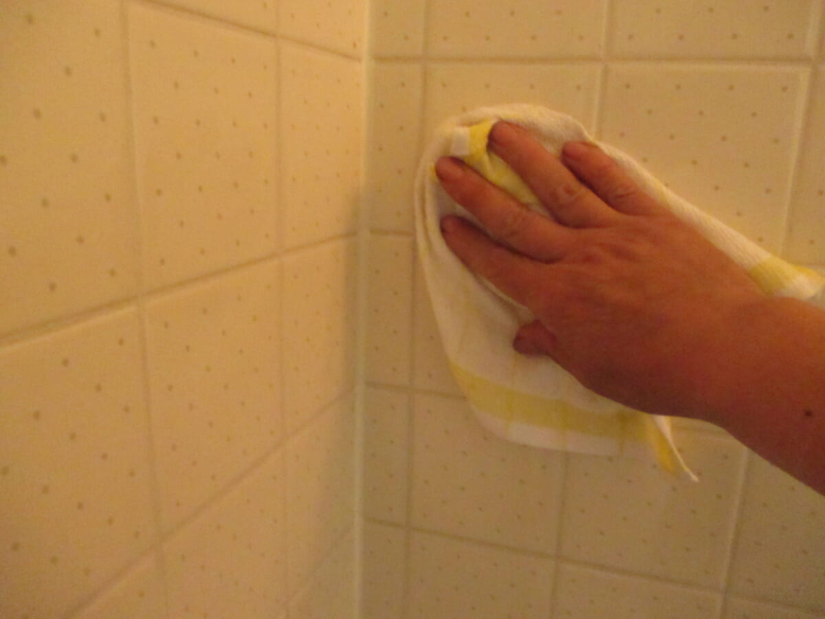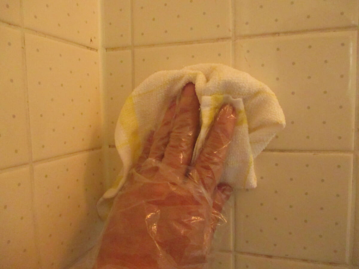 1回の洗浄でカビが完全に落ちない場合は、再び目地幅に沿って洗剤を拭きつけ、同じ作業を繰り返す。洗浄が終わったら、シャワーなどで洗剤分を完全に流し落とし、乾いたウエスなどでよく拭き、目地が乾くまで換気をよくしておく。さっぱりきれいになった浴室の清潔感は格別だ。