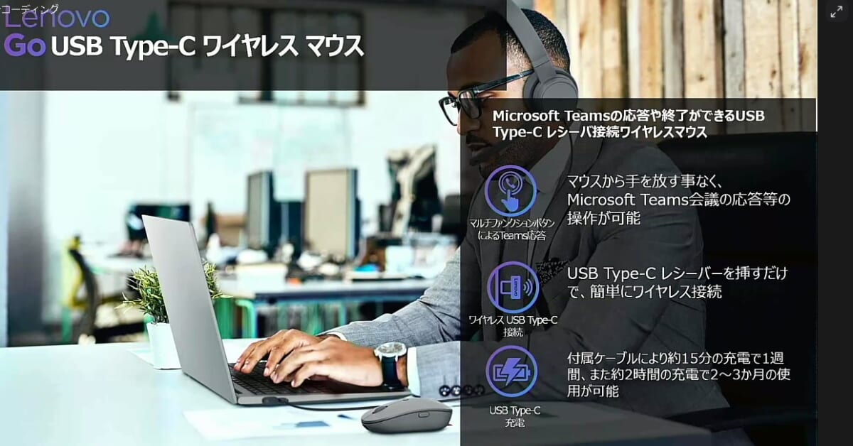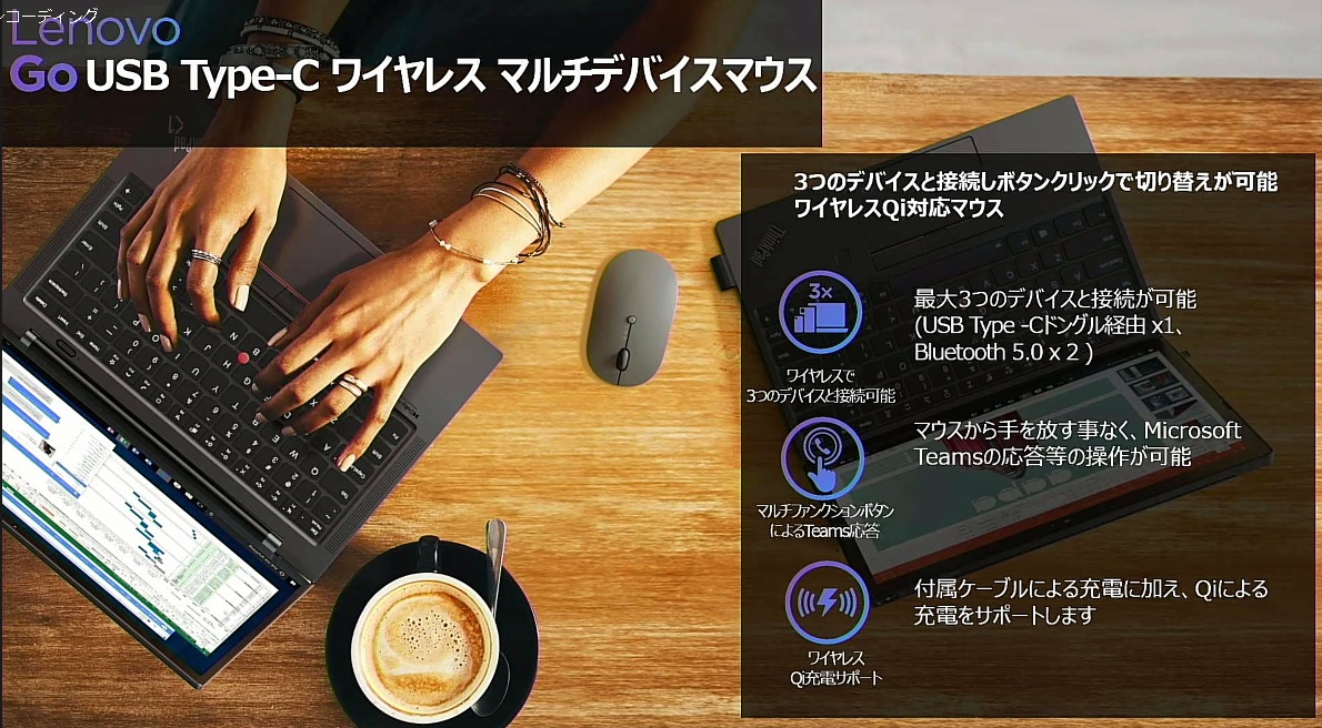 また、同梱ケーブルによる充電のほか、ワイヤレスQi充電にも対応。Lenovo Go USB Type-C ワイヤレス マウスと同様に、コールモードによるMicrosoft Teamsと連動や専用ユーティリティソフトLenovo Go Centralを利用した機能の設定・変更が可能です。