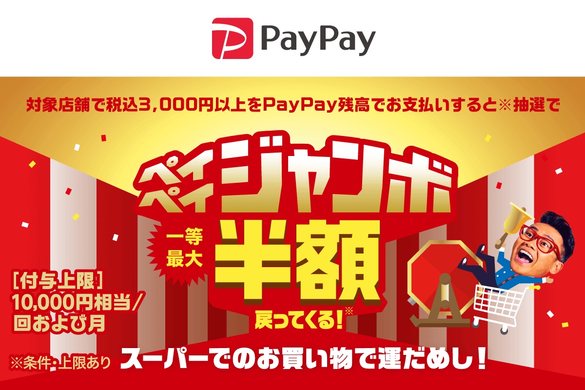 | PayPayが「3,000円以上のお買物で最大半額当たる!スーパーマーケットジャンボ」をスタート |