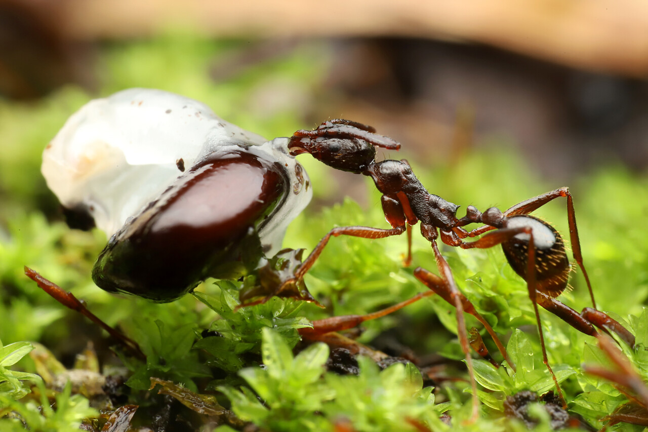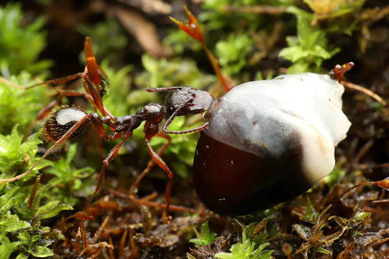 この写真よく見ると、アゴで咥えているのではなく、透明なベトベトで張り付いているだけに見えるのですが、もしかして、大きく重い種子を運ぶのに、このベトベトも役立っているのでしょうか?