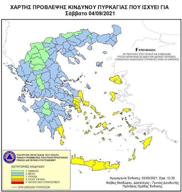 Σύμφωνα με το Χάρτη Πρόβλεψης Κινδύνου Πυρκαγιάς που εκδίδει η Γενική Γραμματεία Πολιτικής Προστασίας του Υπουργείου Εσωτερικών και Διοικητικής Ανασυγκρότησης, για σήμερα Σάββατο 4 Σεπτεμβρίου, προβλέπεται υψηλός κίνδυνος πυρκαγιάς (κατηγορία κινδύνου 3), σε Αττική και Κύθηρα, νότια Εύβοια, Κυκλάδες, Δωδεκάνησα, Σάμο, Ικαρία, Χίο, Μυτιλήνη, Κρήτη και σε περιοχές της Λακωνίας