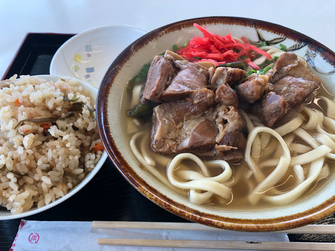 コンビニおにぎりを買おうと思ったのですが、せっかくなので食堂でソーキそばを食べました。