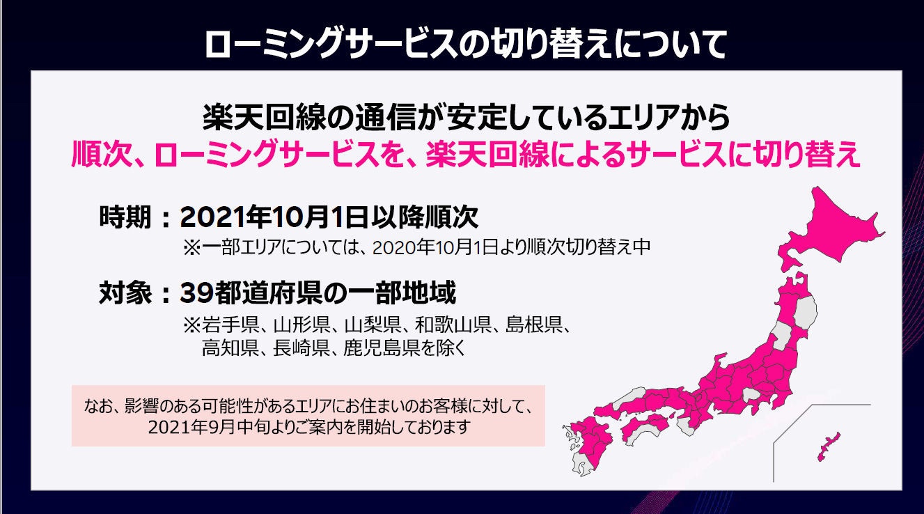 また大阪府や埼玉県、茨城県、栃木県、群馬県、富山県、石川県、愛知県、滋賀県、兵庫県についてはauローミングを2023年3月末にかけて原則終了予定だとしています。auローミングが終了する地域についてはau回線が停波され、楽天回線に切り替えとなります。