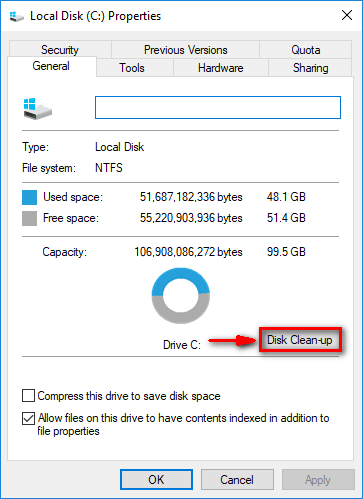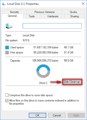 1. คลิกขวาที่ไดร์ฟ C >> Properties จะขึ้นตามหน้าจอด้านล่าง จากนั้นให้คลิกที่ปุ่ม Disk Clean-up