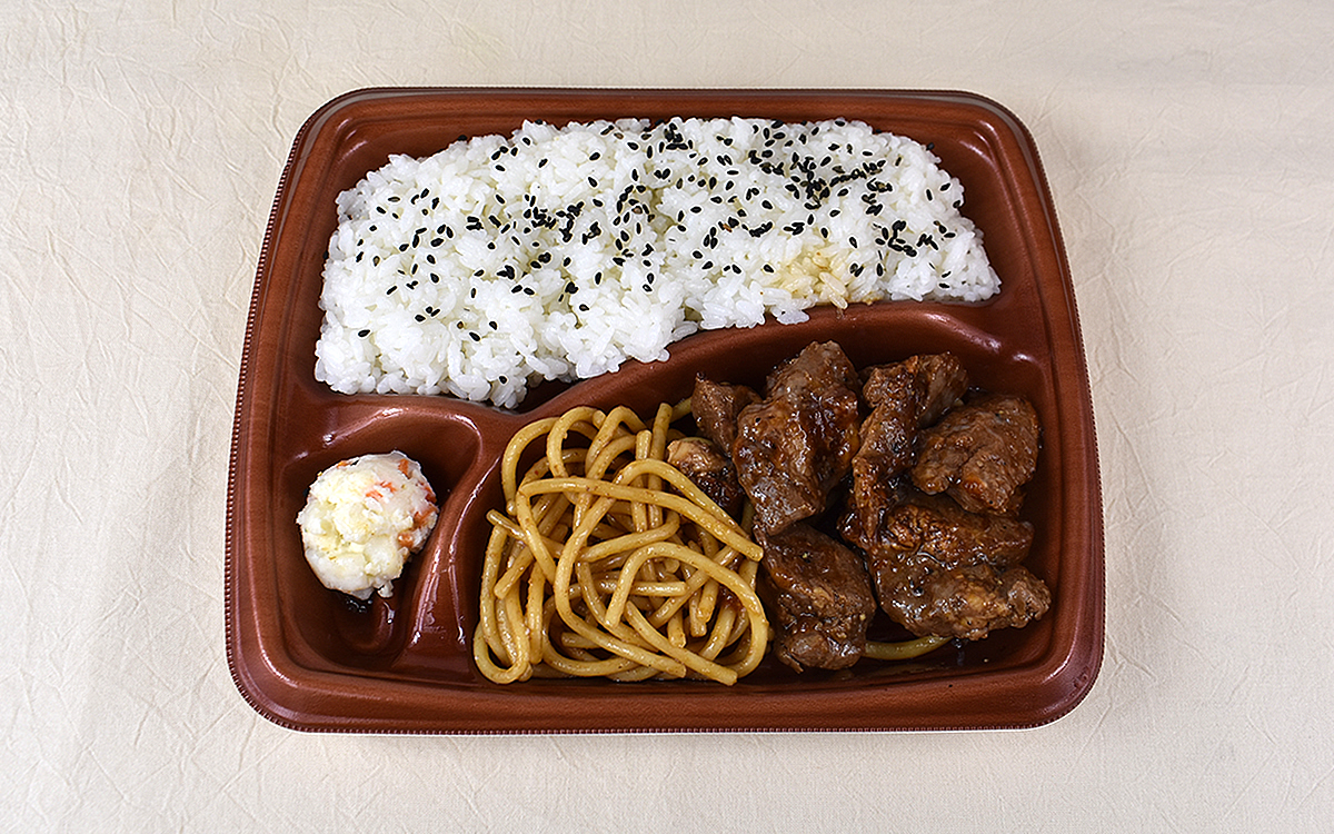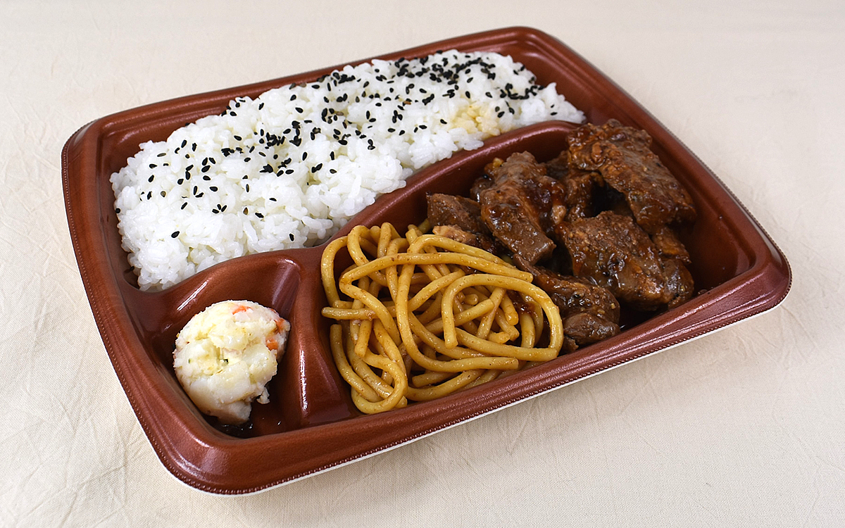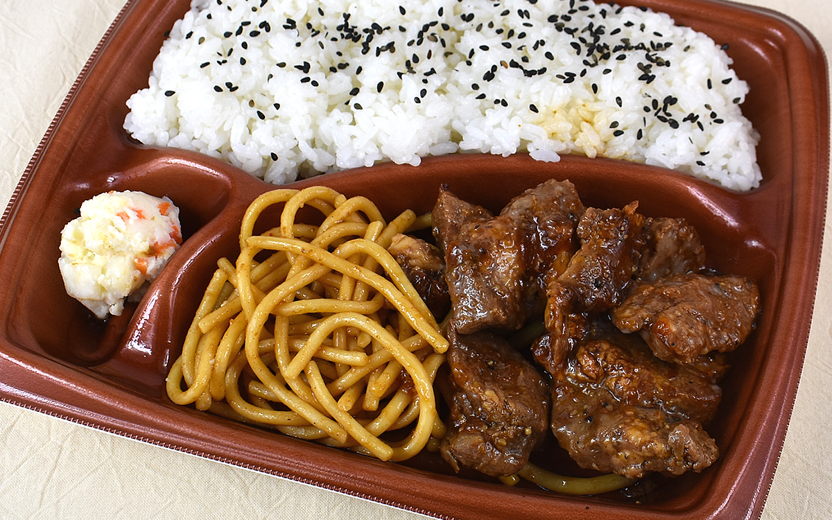 豚焼肉の他には“味付きスパゲッティ”と“ポテトサラダ”を楽しめる同商品。スパゲッティもタレがシミシミで、濃厚な旨味を堪能できます。肉、スパゲッティの順で食べれば濃いめの味つけが連続するため、箸休めとしてポテサラを食べるのがオススメ。まろやかなテイストとにんじんのシャキシャキ食感がアクセントになりますよ。