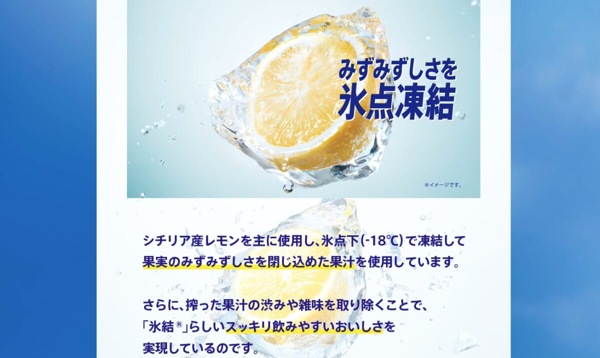 リニューアルのポイントとして着目したのは、持ち味である氷点凍結果汁。この果実感を向上させることで、搾りたての果実特有のみずみずしさと、スッキリした飲みやすいおいしさがいっそう豊かになったとのこと。