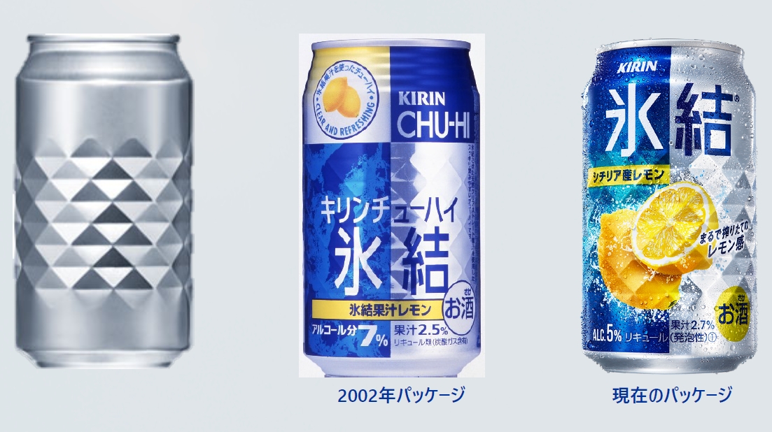「キリン氷結」が世を驚かせたのは味だけではありませんでした。パッケージデザインです。⼤きな特徴は、開栓⾳とともに表⾯にダイヤ形式の凸凹が現れる「ダイヤカット⽸」。商品名からもイメージされる氷の冷たさを、このダイヤ形式の凹凸と、ブルー×シルバーの直線的デザインで体現しています。