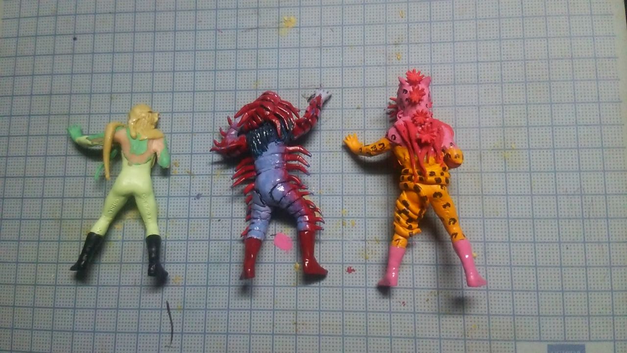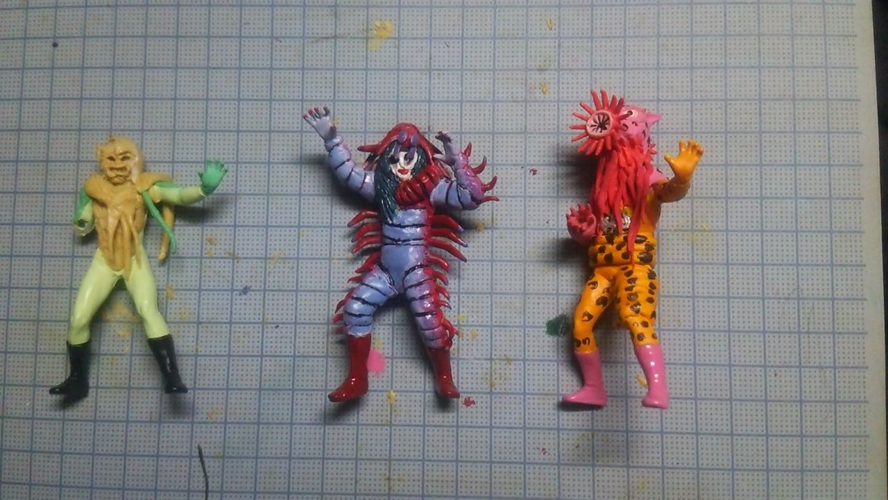 このカテゴリーに記事を書くのは2年くらいぶりだ。 手頃な食玩手に入れたんでゲルショッカー怪人のイソギンジャガー作ってみた。 何が一番難しいかっていうと顔を作るのが難しい。 しかし今回は顔が出来ているようなもんだからサクサクできた。 他にもボロボロだけど昔の作りかけだったgodのムカデヨウキヒ完成。 続いてゲルショッカーのクラゲウルフ制作中。 さて、このクラゲウルフ…、いつ完成するかね…