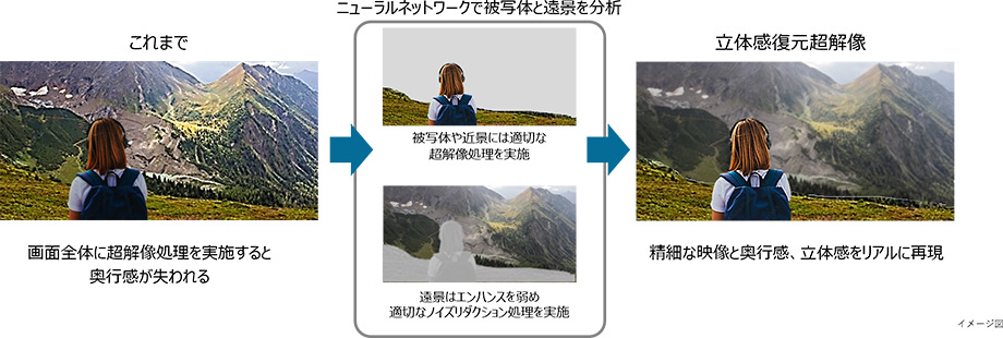 AIエンジンが画面中のエリアごとにニューラルネットワークによる分析を行い、被写体と遠景を識別してそれぞれの部分に適した超解像処理を施す「立体感復元超解像技術」により、画面手前の人物などは細部までクッキリと、背景は超解像処理を抑えることで、実際にその場で見ているかのように奥行き感のある映像を表現します。