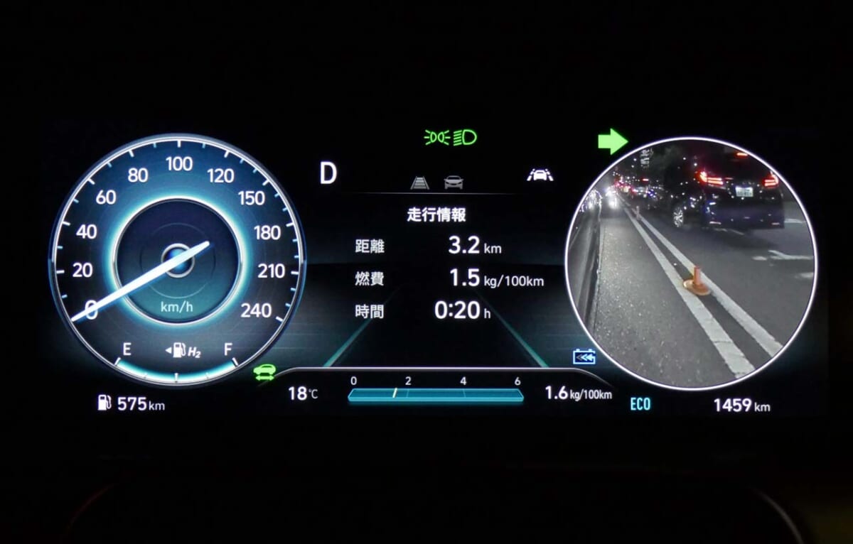 運転中のアシストとして感心したのが「ブラインドスポットビューモニター」です。一般的にこの機能はミラーにオレンジ色の警告表示が出るだけですが、ネッソではウインカーを出すと同時に、出した側の様子を映像でウインドウ風に表示するのです。この映像を通して死角をなくそうというわけです。