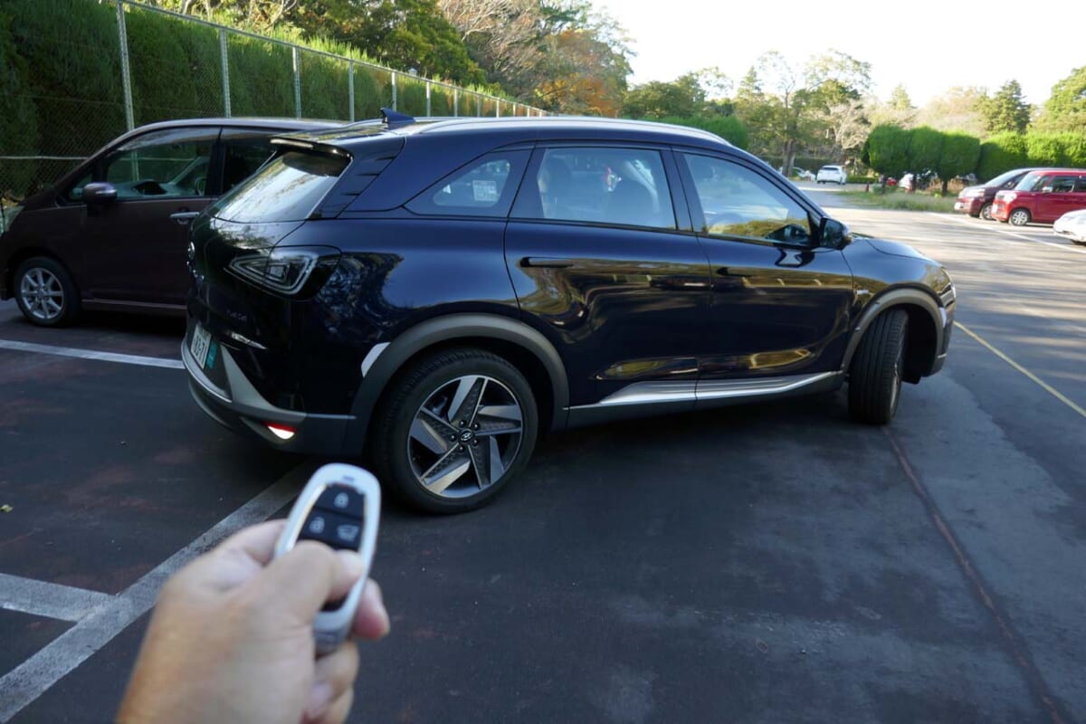操作手順としては、機能をONにしてゆっくり走ると、自動的に駐車できる枠を検出して停止するので、そこで並列駐車か縦列駐車するかを選びます。また、この機能は運転席に座った状態も可能で、その時はコンソールにあるリモートスマートパーキングシステムのボタンを押すだけです。まさに先進性をコンセプトにしたネッソらしい機能といえます。