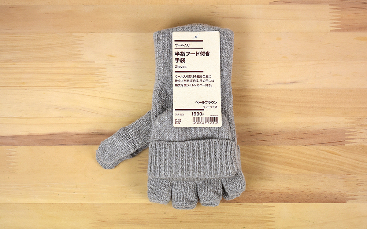 ●二重に仕立てた生地でじんわり暖かい「ウール入り 半指フード付き 手袋」(無印良品)