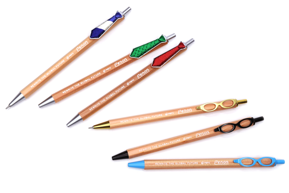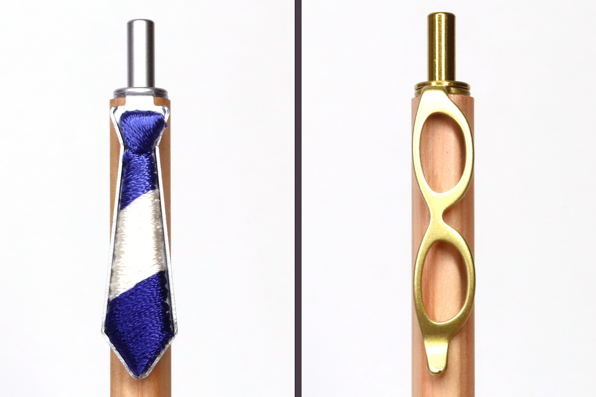 ベースは明るめの木軸に金属パーツをあしらったデザイン。これだけなら単に落ち着いてるペンだなーという印象だが、クリップにあしらわれた「メガネ」「ネクタイ」が、雰囲気を“ほど良くかわいい”感じにしている。