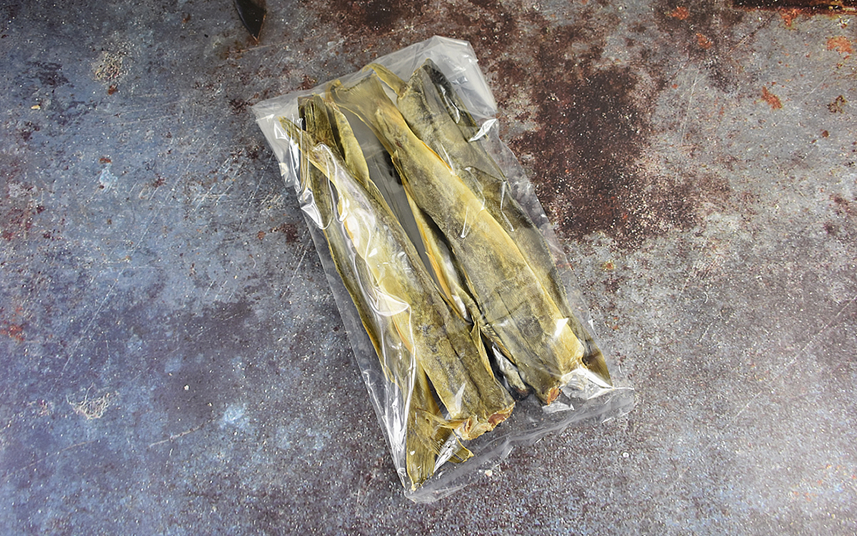 天日干しに適した20~25cm前後の魚体を厳選しているという同商品。今回購入した約250gのパックには、5尾のこまいが入っていました。からからに乾いたこまいは、手で触れてみると当然カチカチです。