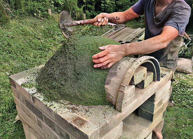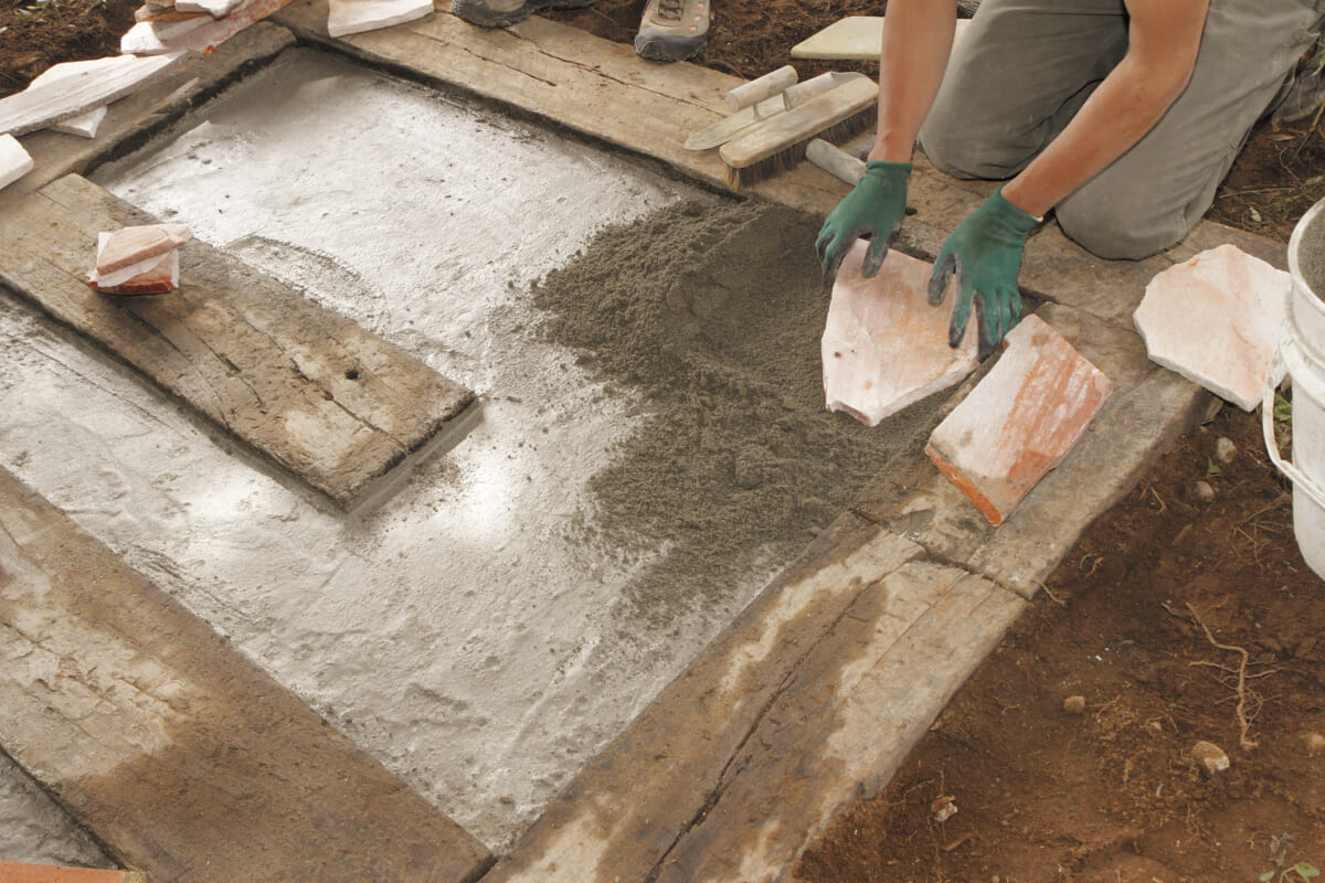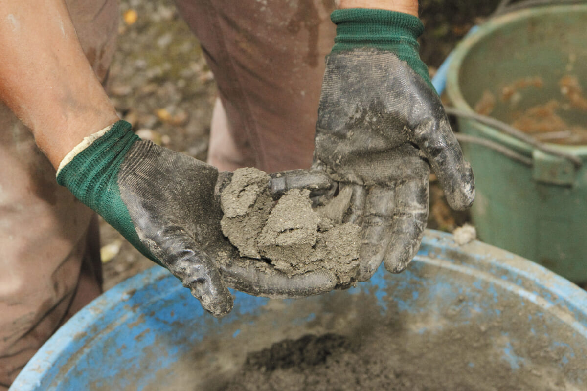 また、セメントは主に砂、砂利、砕石といった再生骨材と一定の容積で混ぜて、モルタルやコンクリートの材料として使うことが多い。モルタルはペイビングの基礎やレンガ積みの目地など、比較的軽量な作品を支えるために使われ、コンクリートは小屋の基礎やピザ窯の基礎など、重量のある作品の基礎に使われる。