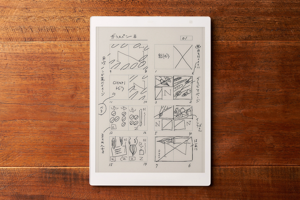 木庭さん「雑誌の校正では、画面上でカラーで確認する必要があるので、タブレットも使います。でも、ペンの書き味がツルツルしすぎていて、僕にとって手書きの延長線上にあるものではないんです。また、ディスプレイが常にカラー表示だと、思考があちこちに飛んでしまいがちです。一方、『クアデルノ』はデジタルペーパーだからこそ、思考に集中できるのが良いですね。そういう意味でタブレットとは役割が全く違っていて、僕にとっては、メモツールの延長にある存在です。手書き用の“画材”はいくつあっても良いんですよ」