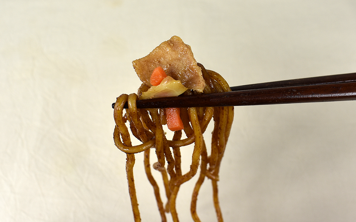 ソースをたっぷりまとった麺は、モチっとした弾力のある歯ごたえがGOOD。300円以下というリーズナブルな価格でありながら、一食300g入りと食べごたえも申し分ありません。