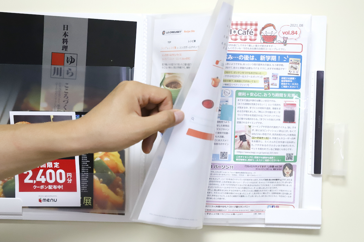 ファイルとしての機能も間違いなく便利で、表紙を開くと内部はクーポンやDMなどの紙片ポケット・封書やチラシ用ポケット・A4書類をファイルできるクリアホルダ型ポケット(A3見開きにも対応)が4連と、大充実!