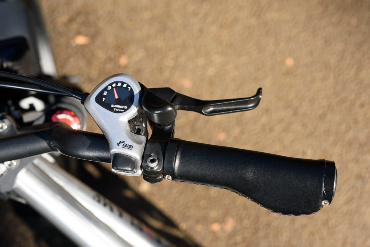 変速ギアはリアのみの7速。ハンドル形状はBMXっぽいアップタイプなので、上体が起きたライディングポジションです。グリップはエルゴノミック形状のレザータイプ。自転車には珍しいハンドルロックや、サイドスタンドなど街乗りで便利な機能もしっかりと押さえています。