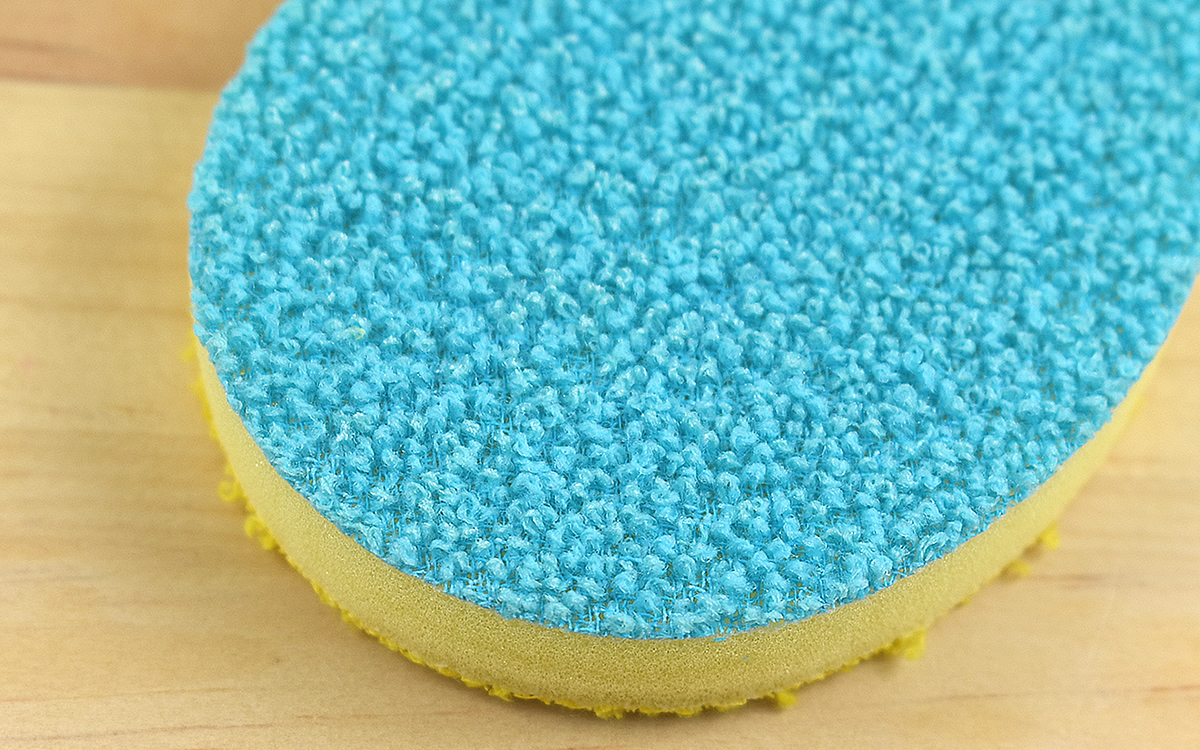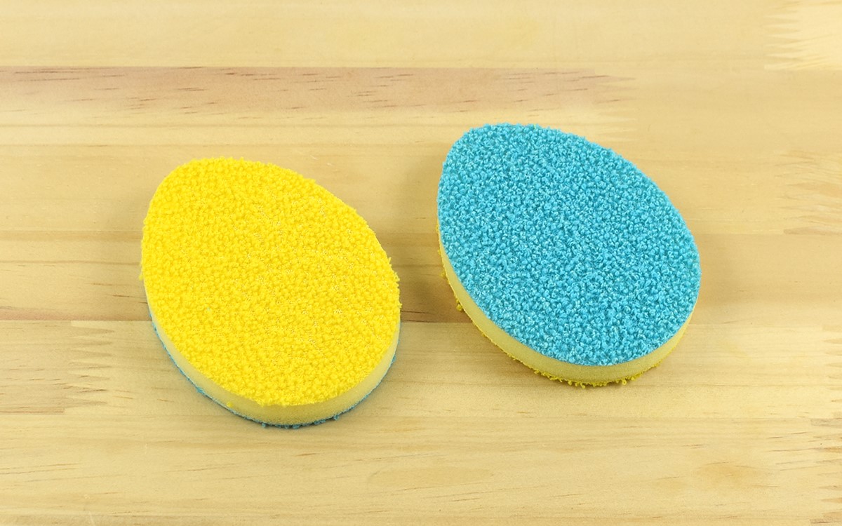同商品の大きさは約70(幅)×95(奥行)×15mm(厚さ)。手のひらにすっぽり収まるサイズ感で、従来のスポンジとは異なるたまご型のデザインになっています。また表裏で色が違い、黄色側の手触りはソフトな印象。一方青色側はハード樹脂加工が施されていて、指でなぞるとザラザラ音が響いたほどです。