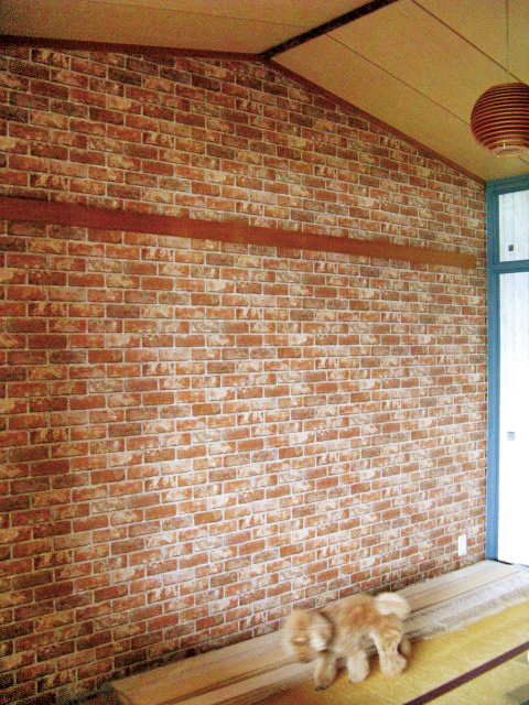 壁紙張りは、1枚目を張ったら、それを基準に2枚目を張っていく。ただ、レンガ柄は縦横に目地がある。これを可能な限りキレイな水平&垂直に仕上げたかったという。そのため、何度も慎重にチェックしながら作業を行なった。その甲斐あって、壁紙はパーフェクトな仕上がりになっている!