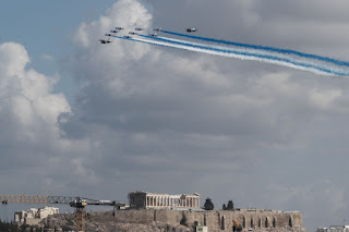 Λίγο λεπτά μετά τις 11:00, τα δύο Rafale και οι «Patrouille de France» σχημάτισαν τα χρώματα της Ελλάδας στον ουρανό, πάνω από την Ακρόπολη, αποχαιρετώντας για το ταξίδι της επιστροφής στη Γαλλία.