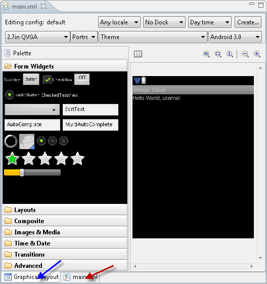 yang di dalam kotak hijau merupakan file xml yang akan kita gunakan merancang tampilan dari aplikasi yang akan kita buat. main.xml ada dua tab, yaitu grafik dan code nya.
