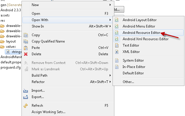 maka klik kanan pada file strings.xml pilih open with>android resource editor, seperti pada gambar: