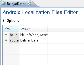 yang di dalam kotak biru pada Package Explorer diatas merupakan file strings.xml yang akan digunakan untuk “membantu” file main.xml yang ada di folder layout. jika dalam membuka strings.xml tampilannya seperti: