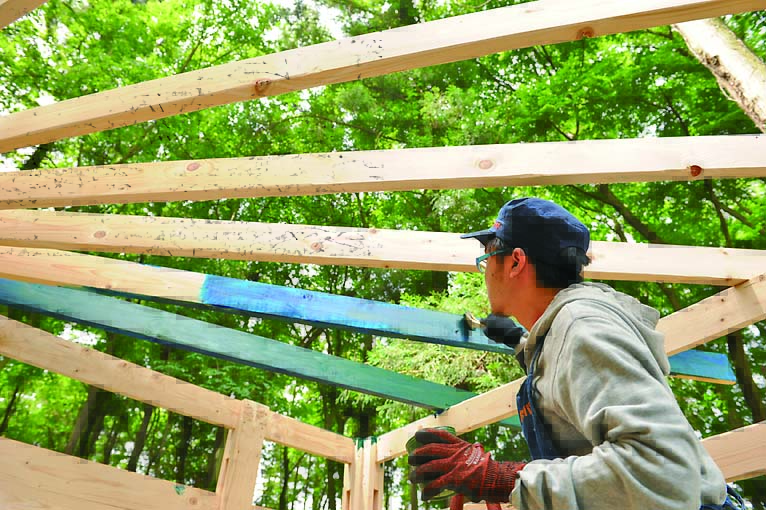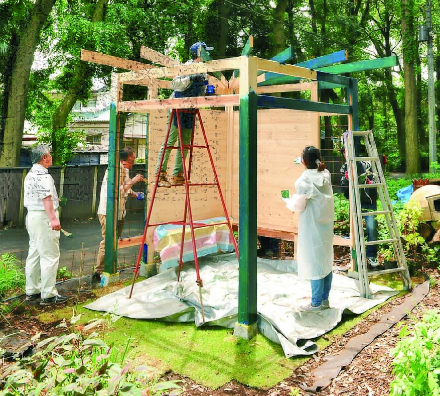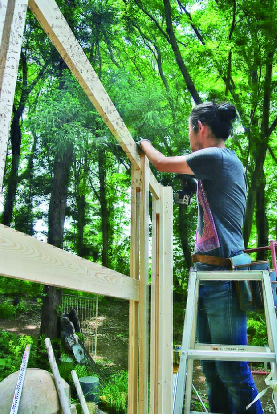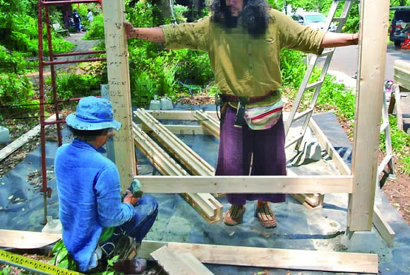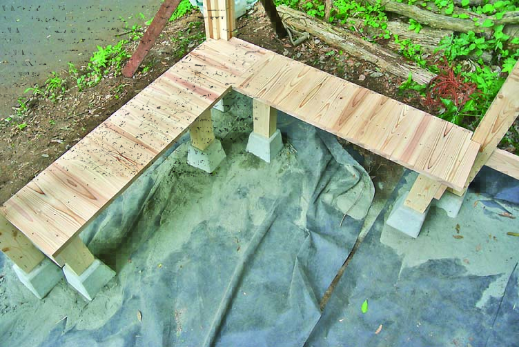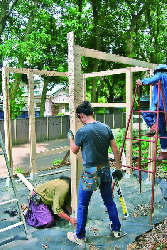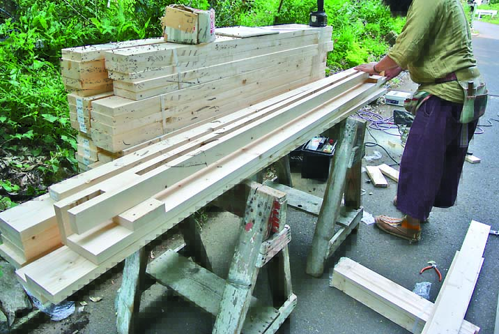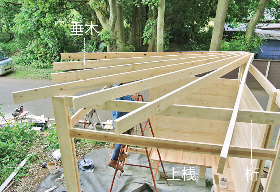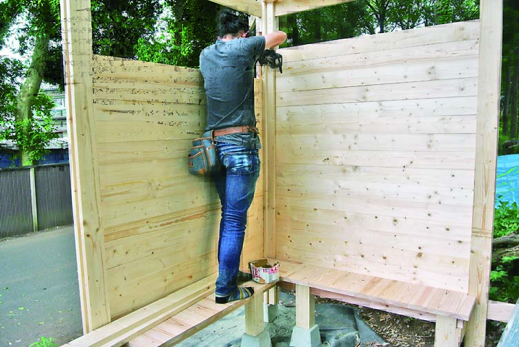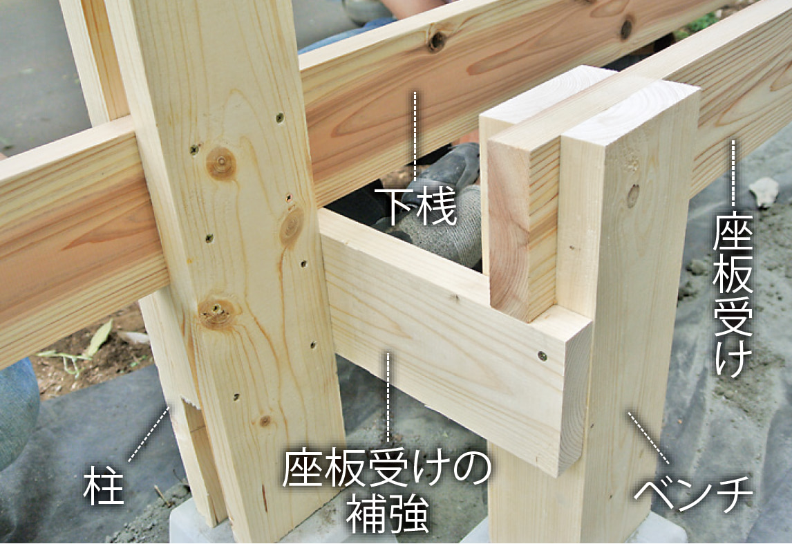 柱、ベンチ、壁、垂木、桁まで木部の材はすべて間柱材。長さ105mmにカットした間柱材をサンドイッチするように組み立てた柱がポイントで、壁や桁はログハウスの工法のひとつであるピース・エン・ピース工法の要領で取りつけていける。