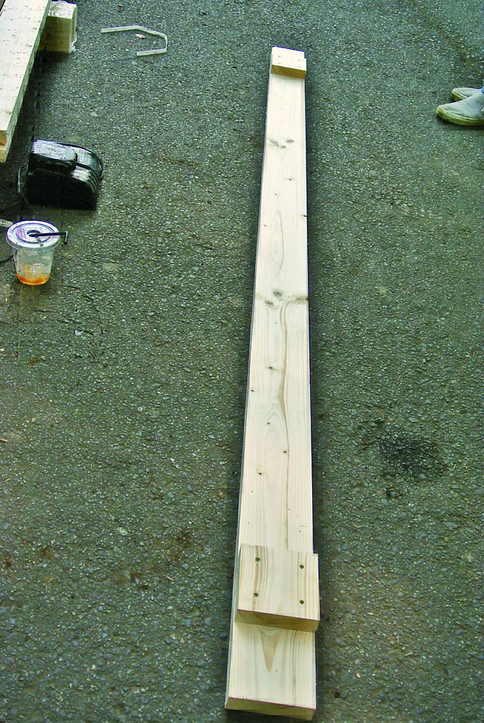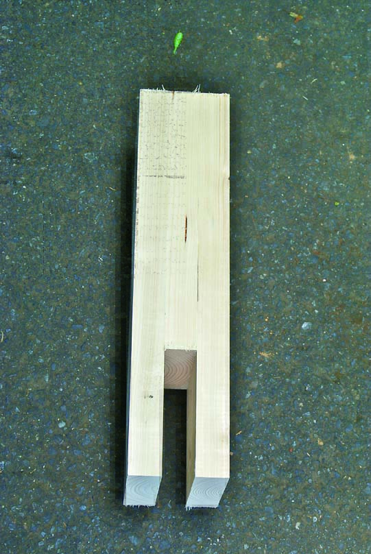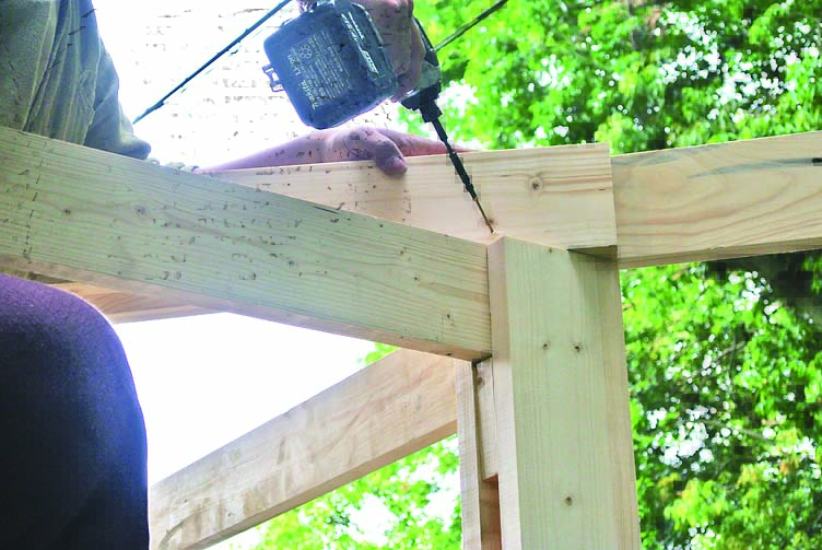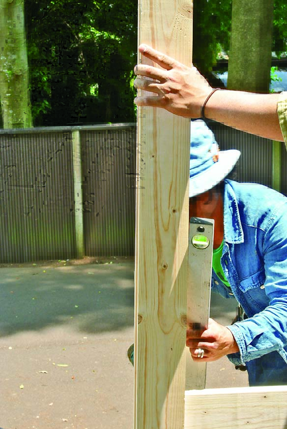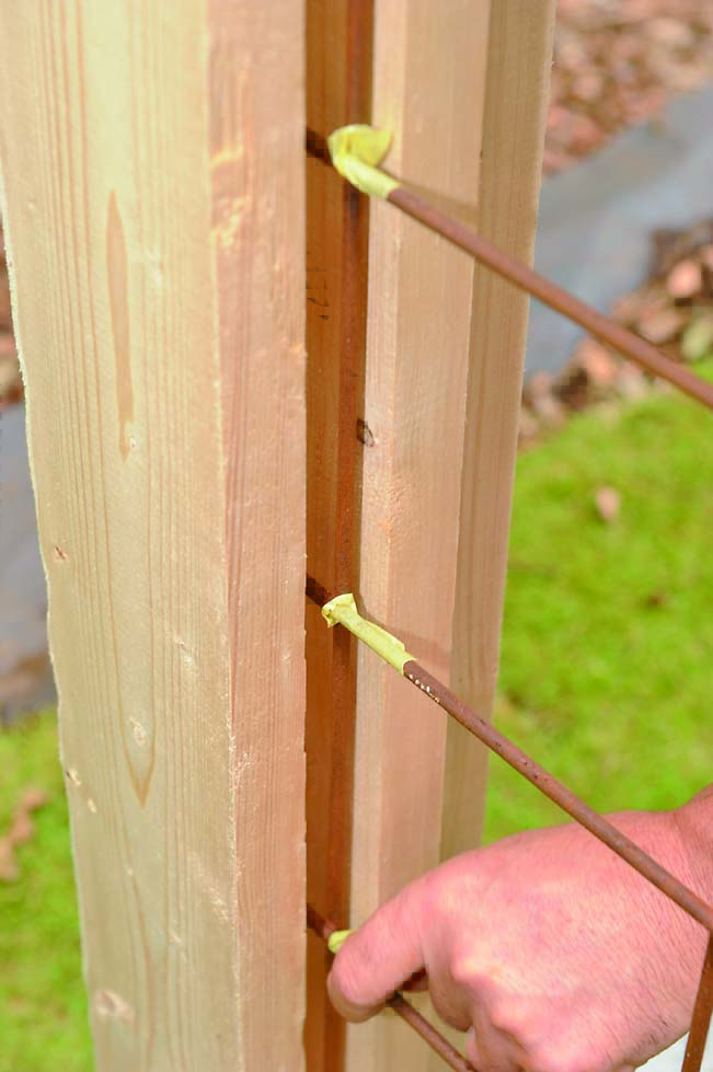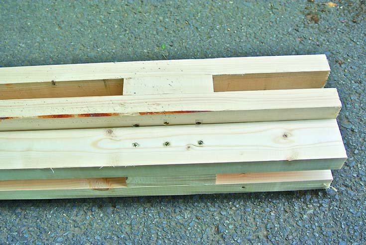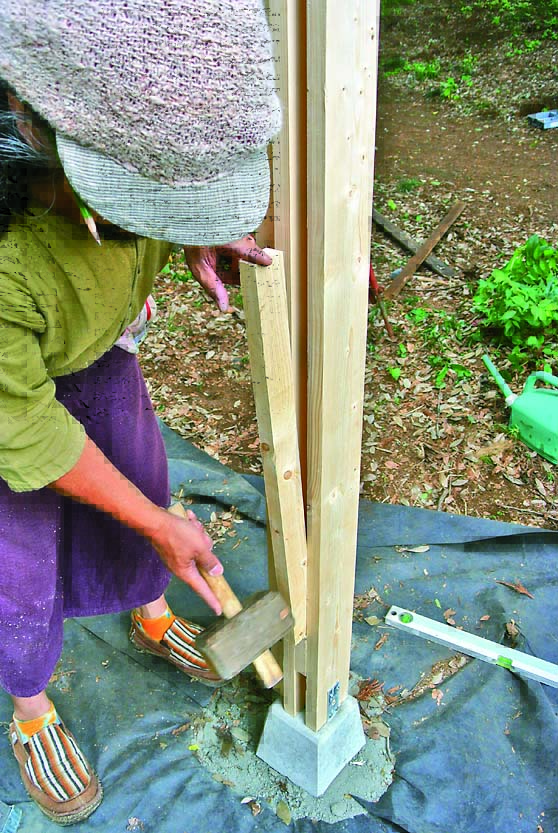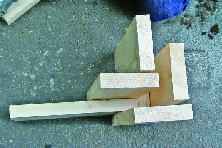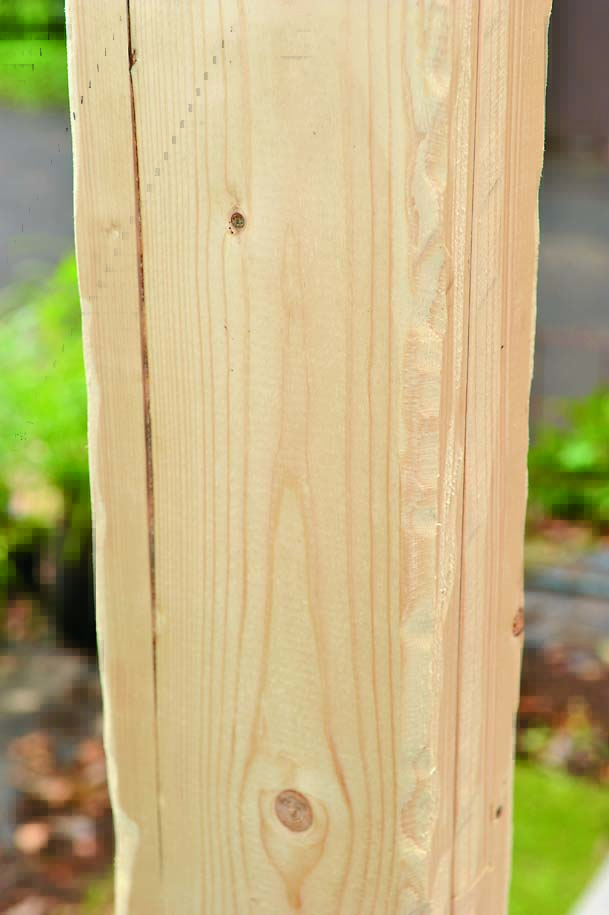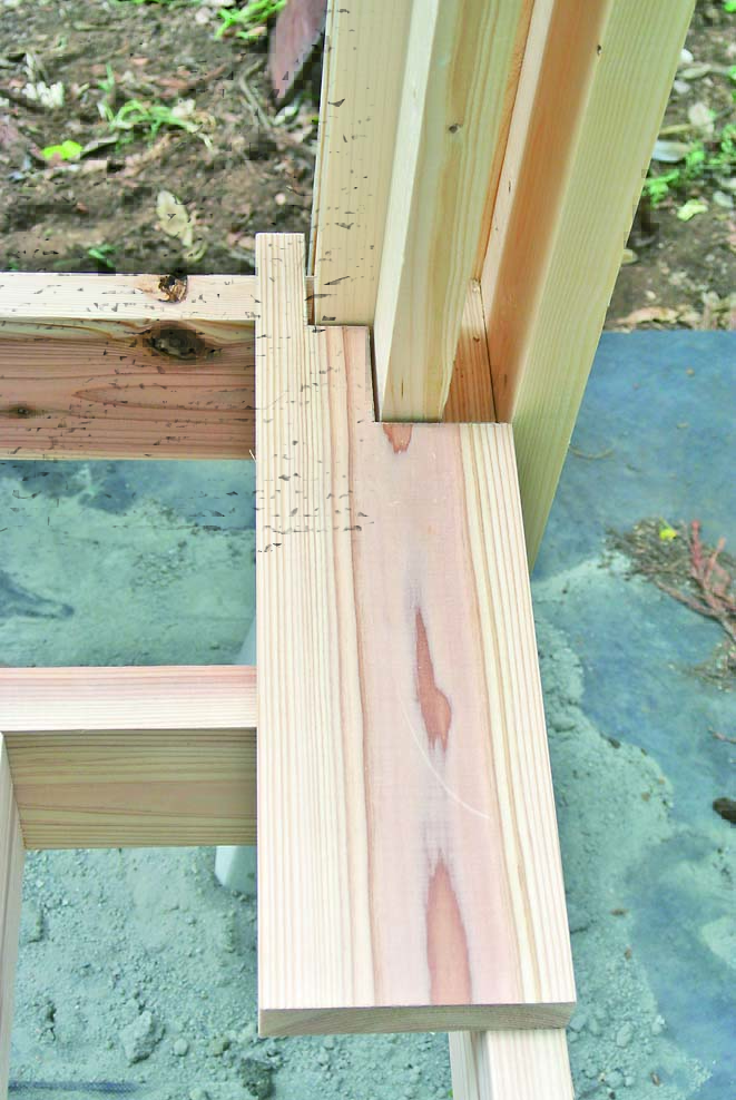 柱も間柱材で製作。桁や横桟、壁を柱にはめ込むように取りつけるため、105mmにカットしたものをサンドイッチするように組み立てた。