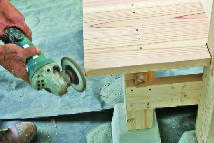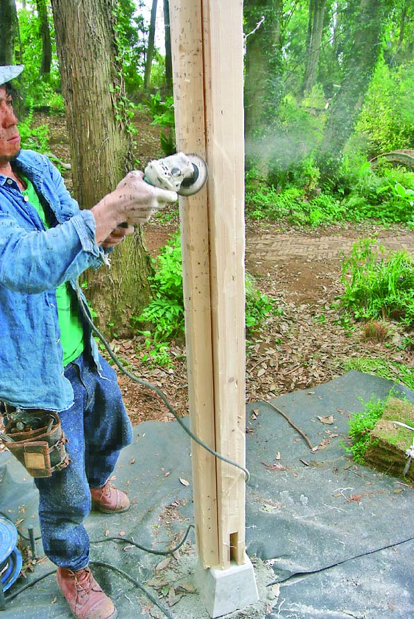 仕上げに木工用ディスクを装着したディスクグラインダーで柱や桁にダメージ加工し、使い込んだ風合いを演出したが、仕上げは好みで。自由度の高い作りになっているので、自分なりのベンチ付きパーゴラが作れるだろう。