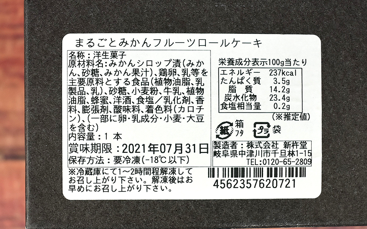 岐阜県中津川市に本社を構え、スイーツの製造を行っている「新杵堂」。「お菓子で人々を幸せにする」を企業理念とし、和洋折衷な独自のスイーツを多数生み出しています。同社が販売する「まるごとみかんフルーツロールケーキ」はおしゃれな箱に入って届き、期待感もばっちり。切り分ける前から見えるみかんの断面が美しく、ワクワクしてしまいますね。
