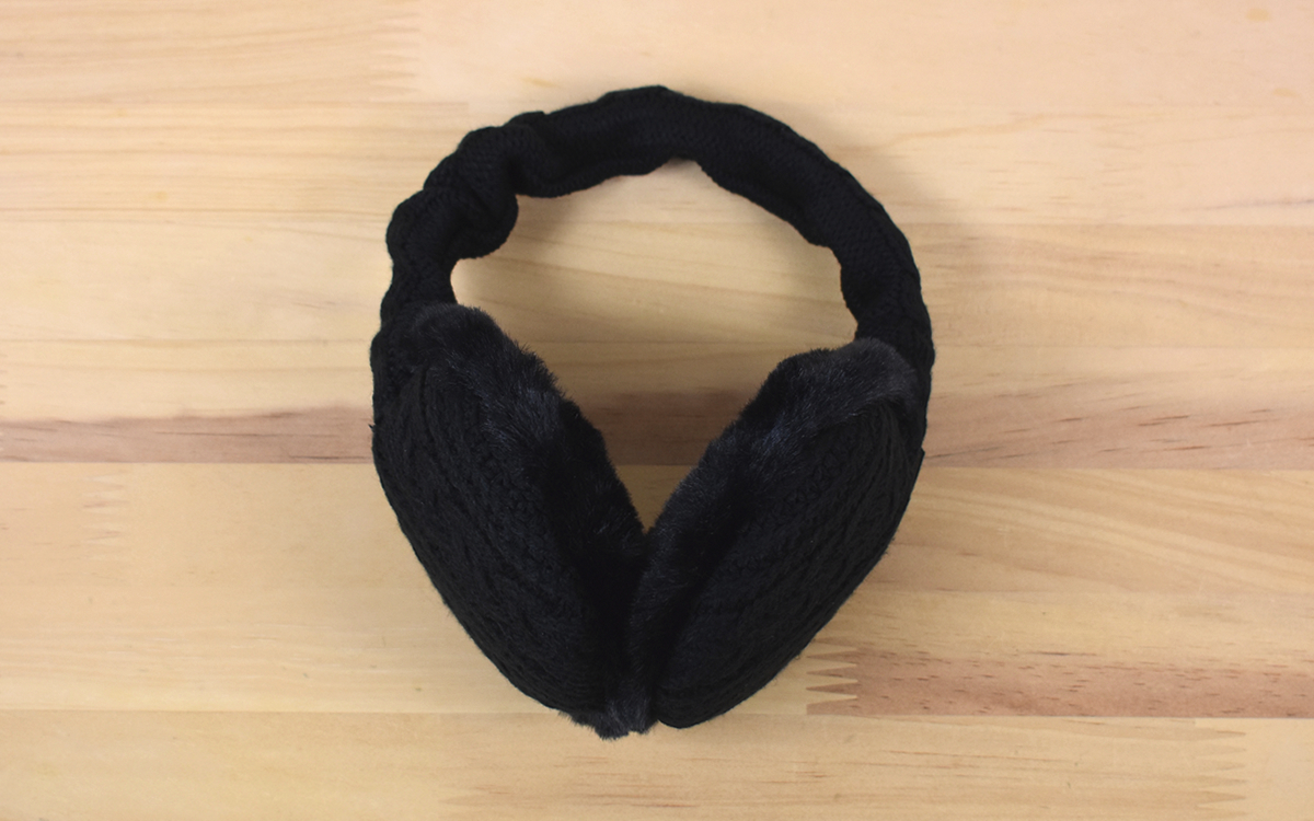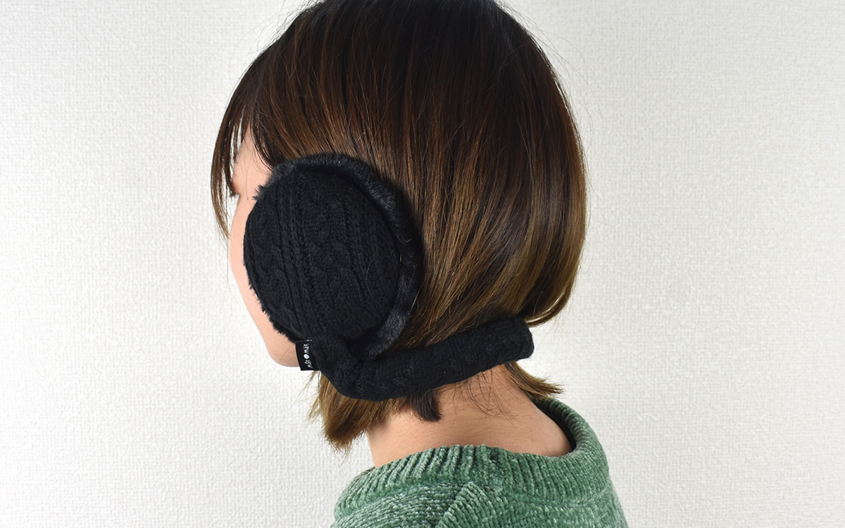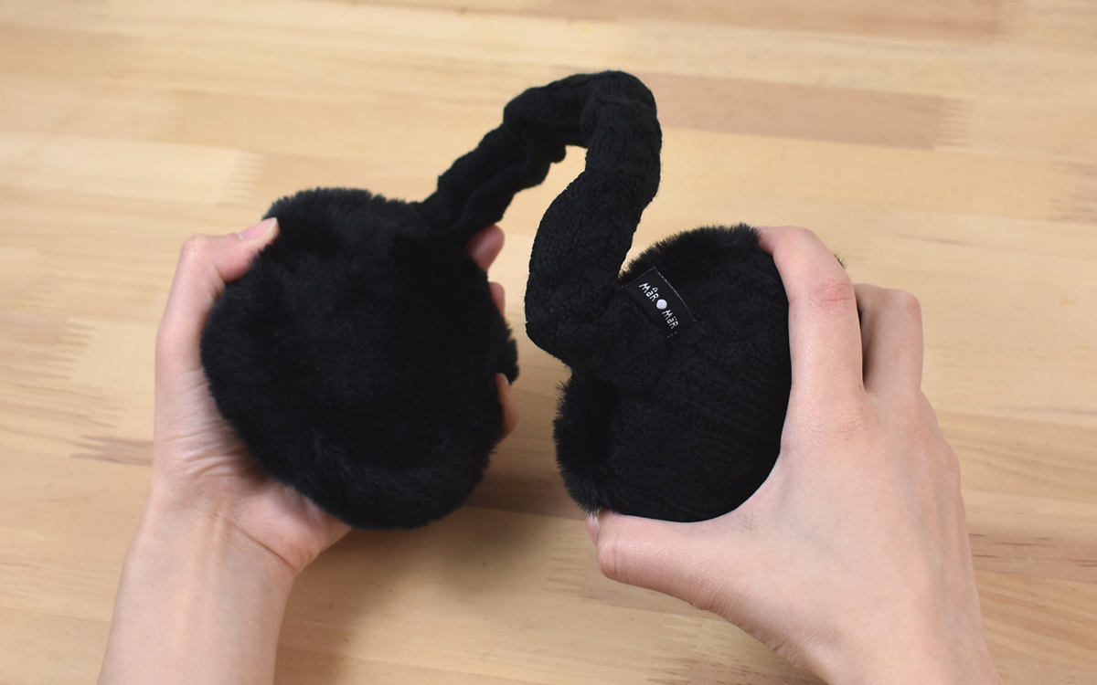 同商品の特徴は、ヘッドバンドを引っ張って長さを変えられる点。さらに軽く捻ると両側の根元を直角に曲げることが可能です。また、耳をあてる部分はニットで編まれた布地になっており、あたたかみのある素材感がGOOD。耳に直接当たる内側部分はフワフワとしたファーのやわらかい手触りが楽しめますよ。