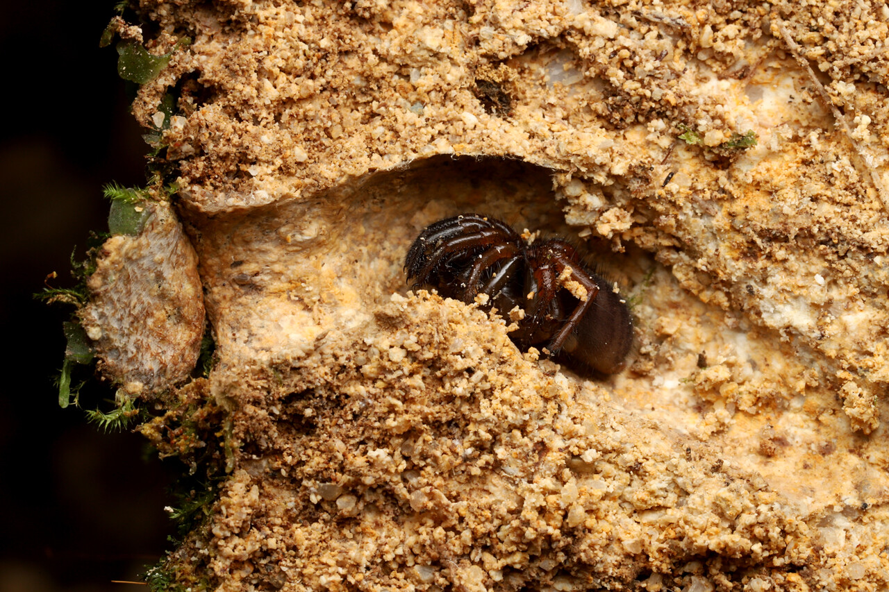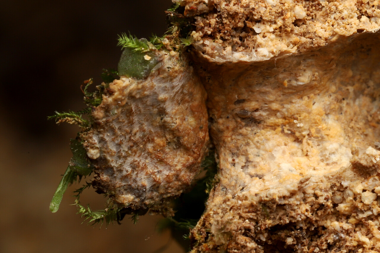 地中に蓋付きの巣を作って、獲物を待ち伏せするオキナワトタテグモ。 斜面などに巣が作られているのをよく見かけます。 石と石のわずかな隙間に巣があったようで断面を撮影することができました。 蓋の表は土や苔で分かりにくくなっていますが、内側には糸が見えます。